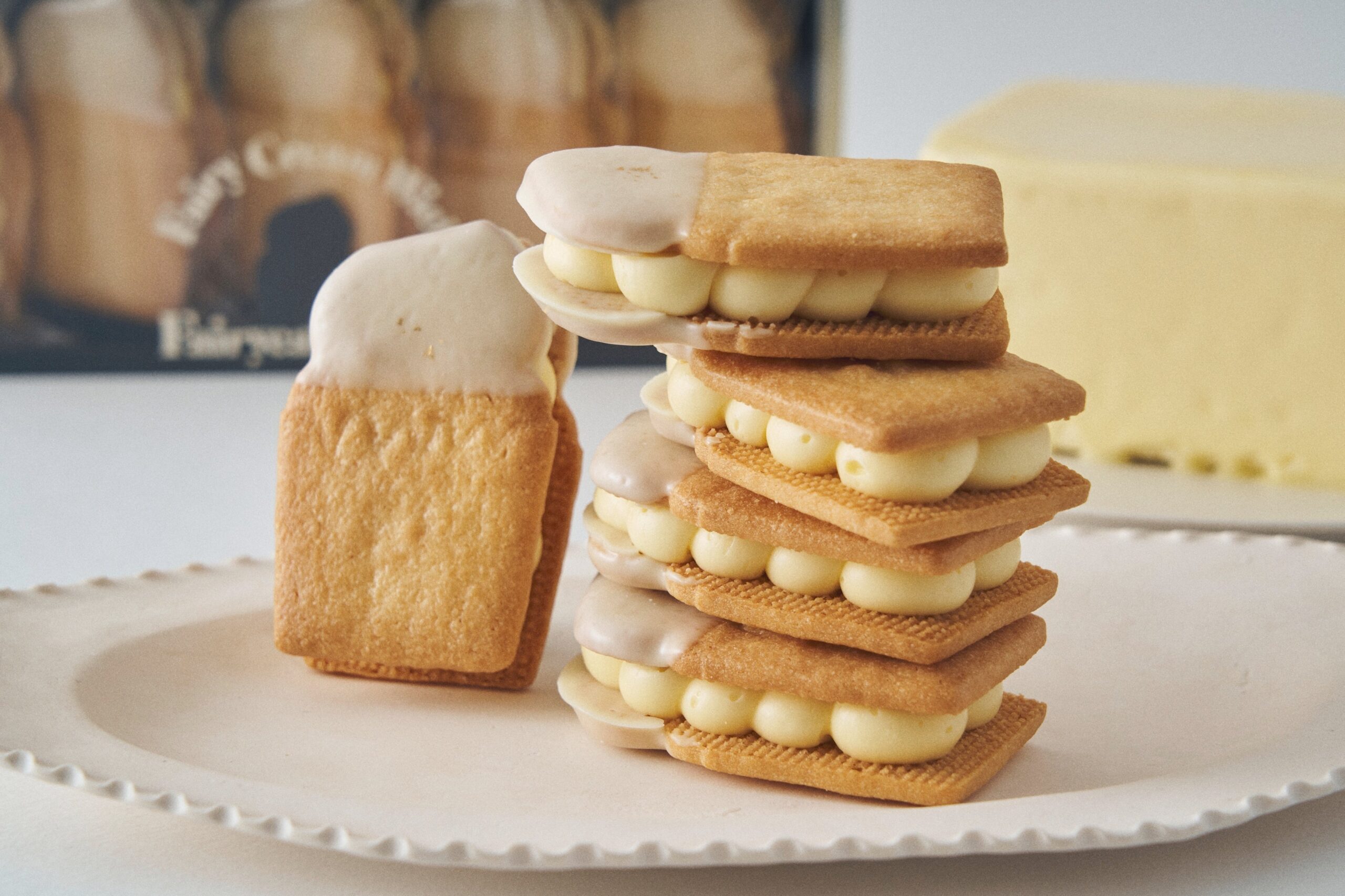 新作はシリーズ初の「バターだけ」の生バターサンドで、フランス・ノルマンディ産発酵バターを主役に据えた点が特徴です。発酵バターをたっぷり使ったクリームをビスケットで挟み、甘みを引き立てるゲランドの塩とホワイトチョコレートのハーフコーティングで、ミルキーなコクと軽い後味の両立を狙いました。社内試食では「歴代でいちばん好き」と評価され、シリーズの集大成と位置づけられています。