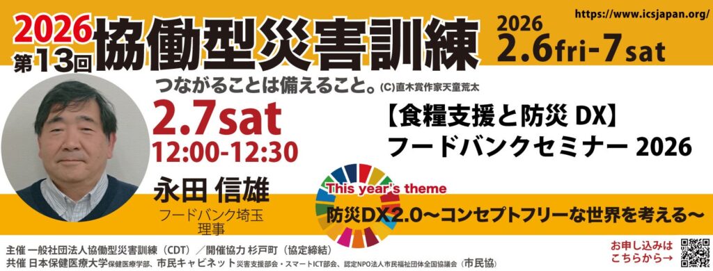 フードバンク埼玉は2026年2月6日・7日の2日間、「第13回協働型災害訓練 in 杉戸」で、理事の永田信雄氏が「食のセーフティネット・フードバンクの現状と有事対応について」をテーマに講演とセッションを行います。会場は彩の国いきいきセンターすぎとピアに加え、オンライン(Zoom)でも実施し、定員は会場100名、Zoom200名です。