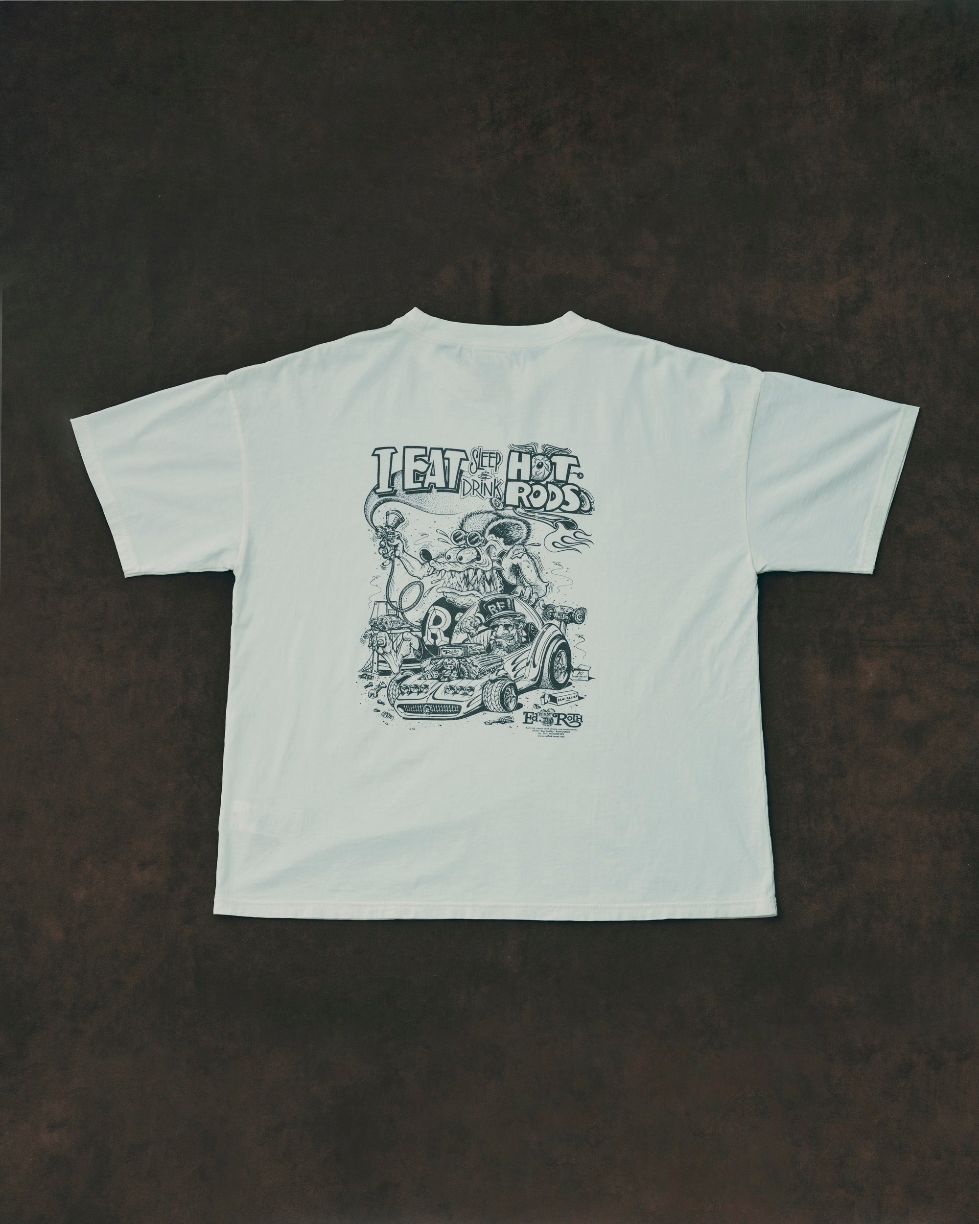 本商品は、1960年代の米国で生まれたローブローアートのアイコン「RAT FINK」のグラフィックを採用し、REMI RELIEF独自のSP加工で表現します。SP加工は自然退色の原理を再現する加工で、ヴィンテージ古着のような表情を狙うとしています。