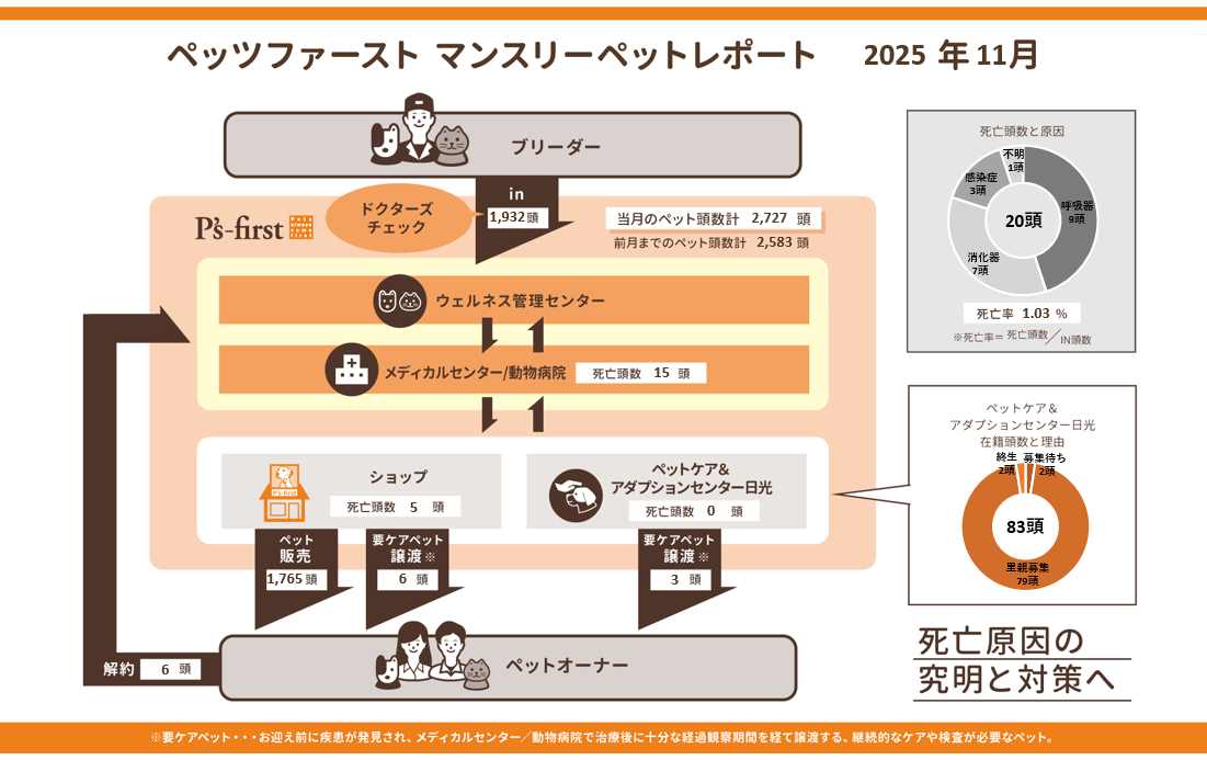 治療や継続ケアが必要な「要ケアペット」は、店舗と「ペットケア&アダプションセンター日光」から計9頭が譲渡され、同センターでは11月末時点で83頭が在舎しています。解約は6頭で、返還後に4頭は新しい家族が決まりました。死亡原因は呼吸器9頭、消化器7頭などで、オンライン診療の拡大や検査体制強化を続け、呼吸器疾患への監視を重点化する見通しです。