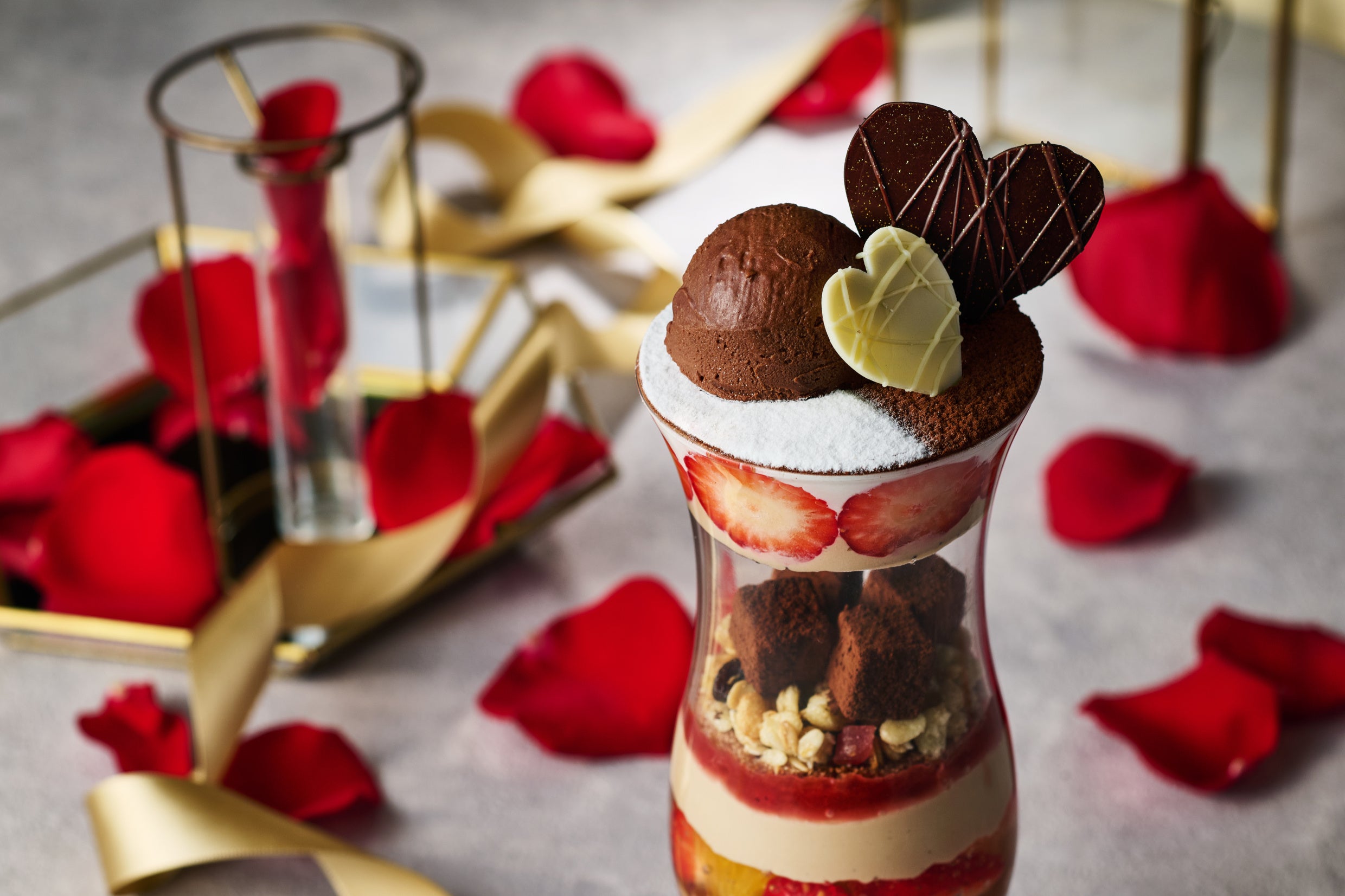 同パフェはバレンタインシーズン向けに、ロンネフェルト社のスリランカ産紅茶「ヌワラエリア」をミルクで煮出した紅茶クリームと、ヴァローナ社のチョコレートを軸に構成します。トップにはハート型のビターチョコとホワイトチョコ、ベルギーチョコレートアイス、国産いちごを配し、上層で紅茶の香りとクリーミーさを強調します。下層は生チョコとグラノーラで食感を加え、紅茶クリームといちごソース、白ワインジュレ、国産いちごで後味を整えた後、ヴァローナの「グアナラ(ビター)」と「カライブ(酸味のバランス)」の2種を使い分けたムースで締めます。見た目は、生チョコがショーケースに並ぶような“ガラス越し”のビジュアルを意識したとしています。
