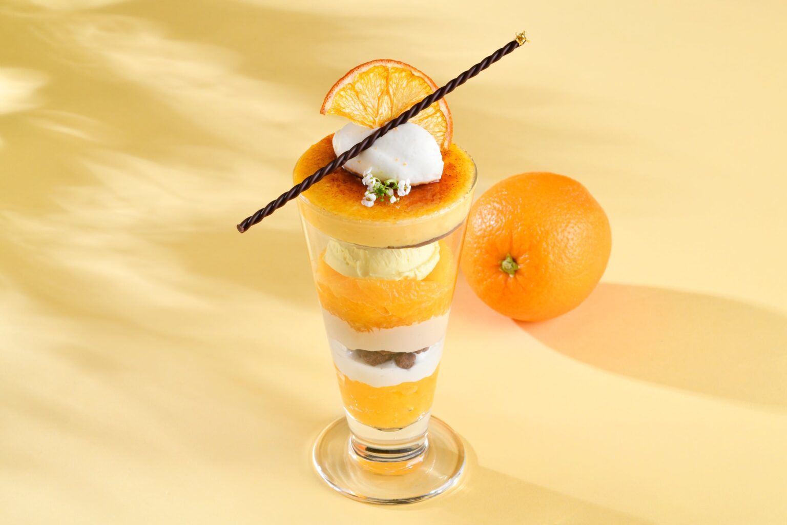 主役の清見オレンジを、ブリュレ風のオレンジクリーム、バニラアイス、紅茶のムース、チョコクランブル、清見オレンジのゼリーなどと層状に重ね、濃厚な甘みと爽やかな香りを生かした初夏向けメニューとして展開します。