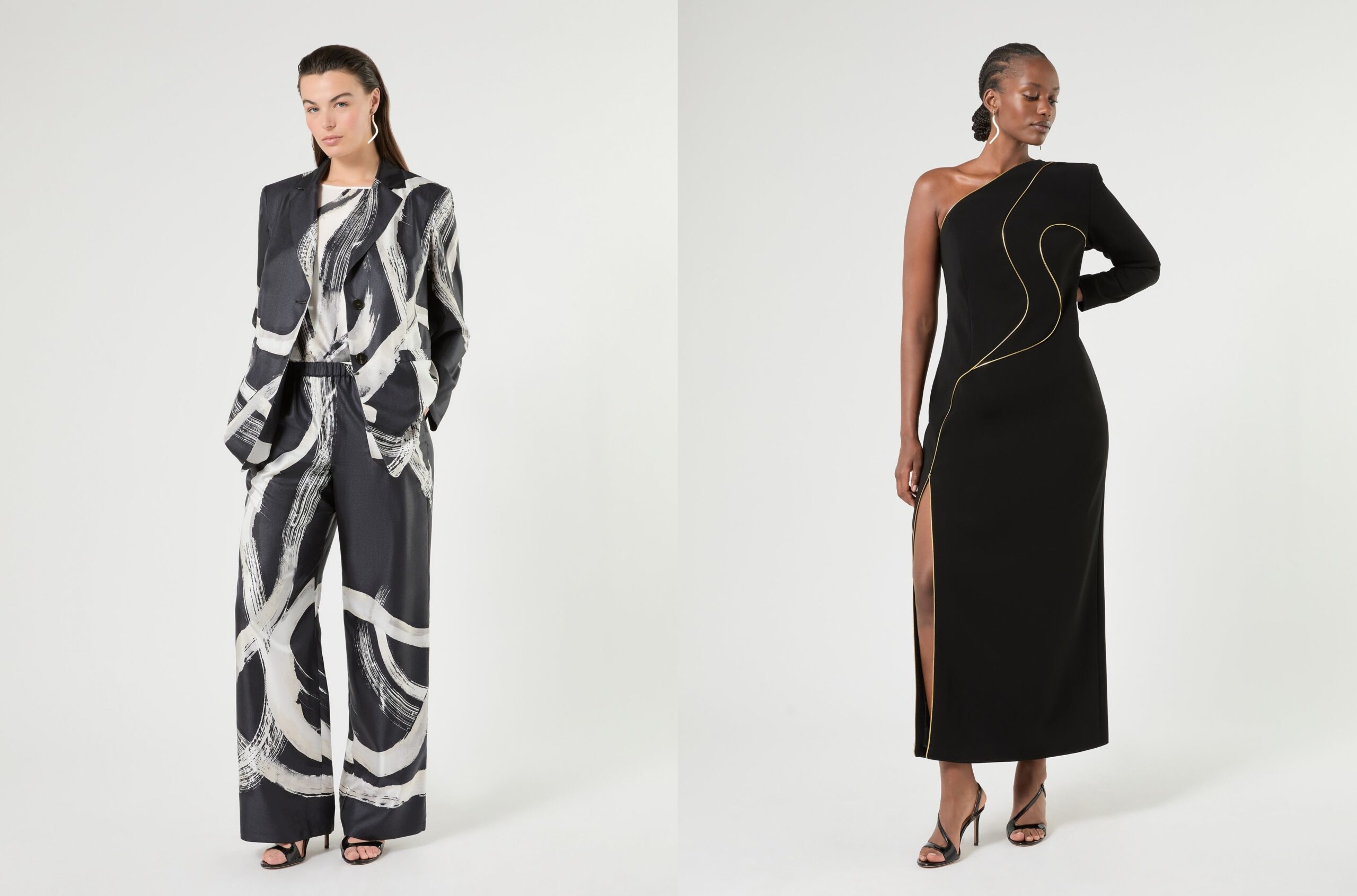 同コレクションは、フォルムや曲線、象徴的なディテールで「歓び」を表現するとし、幾何学プリント、バックステッチ、装飾的ディテールを組み合わせます。色はテラコッタからディープブルー、ブラックを基調に、パールホワイトを差し込むパレットを採用します。