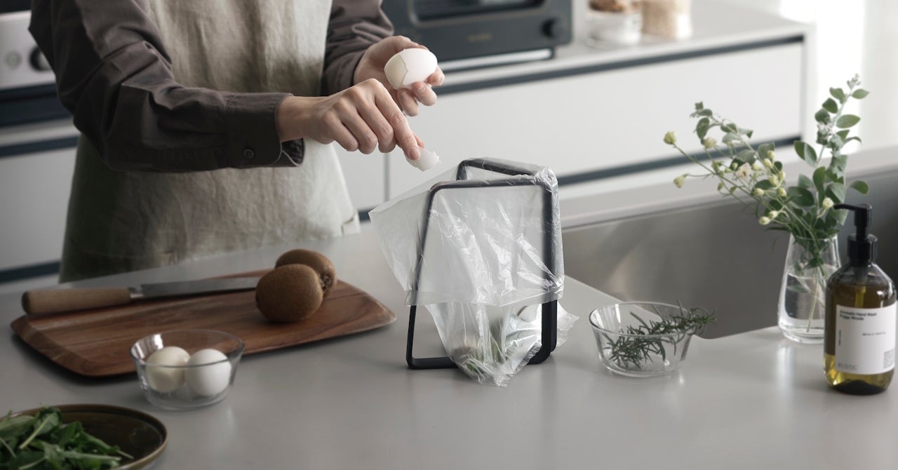 滑り止め一体型で袋が滑り落ちにくい点も特徴です。凹凸を最小限にして手入れしやすくし、フレームを閉じると簡易フタとして使えます。閉じた状態は約3cmの薄さで収納可能です。