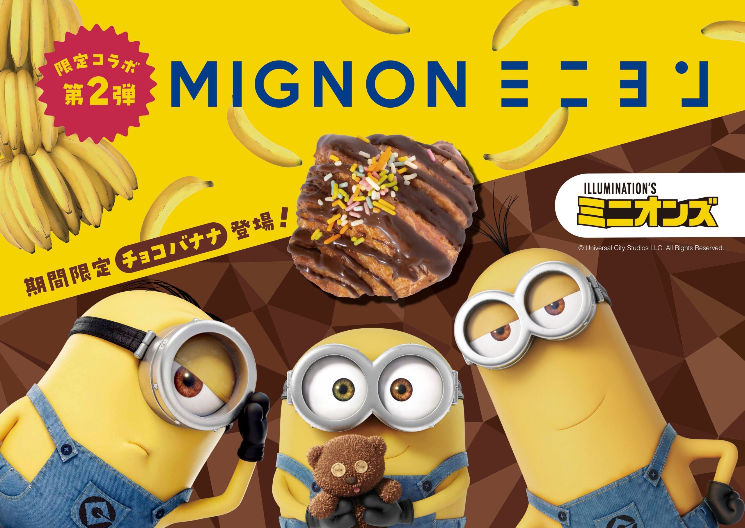 ミニクロワッサン専門店「ミニヨン」は、ミニオンズとの限定コラボ第2弾として「チョコバナナ」のミニクロワッサンを2026年3月1日から3月末まで全国13店舗で期間限定販売します。在庫がなくなり次第終了で、天王寺ミオ店のみ3月6日からの開始です。