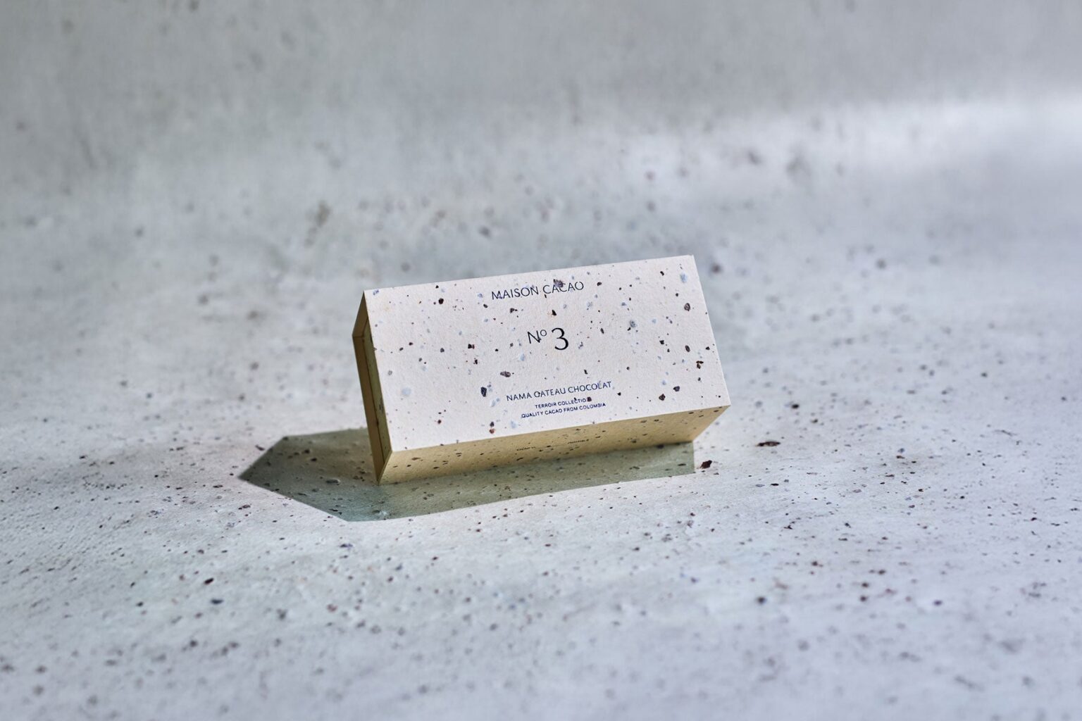 原料にはコロンビアの自社管理農園・契約農園で栽培したカカオを使い、カカオマスや砂糖などの配合を0.1%単位で調整する独自のブレンディングで設計します。No.3はコロンビア・サンタンデル地方のカカオを使用し、カカオハスクを漉き込んだ手すき和紙のパッケージで展開します。