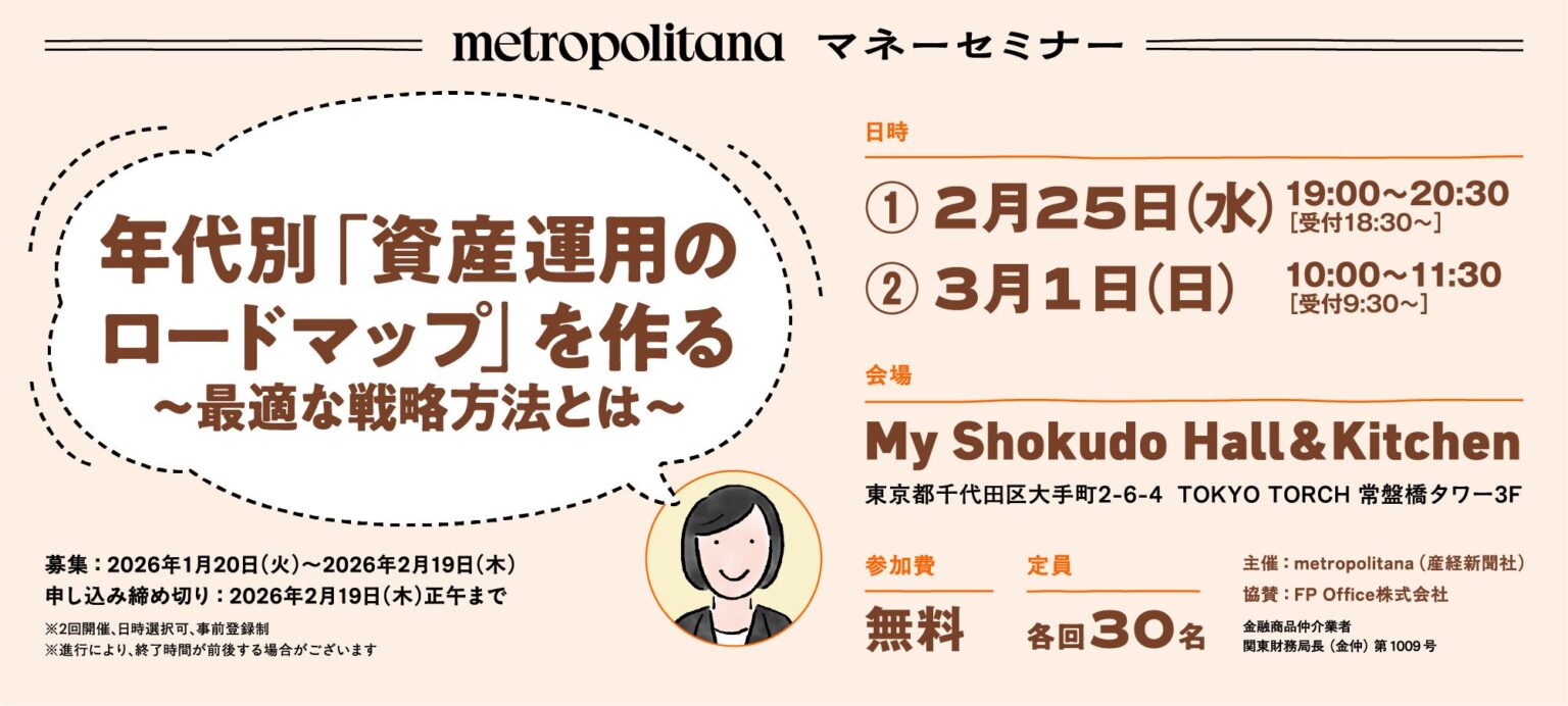メトロポリターナは、資産運用の考え方を学ぶ無料マネーセミナー「年代別『資産運用のロードマップ』を作る ~最適な戦略方法とは~」を、2026年2月25日19時からと3月1日10時からの計2回、東京都千代田区のMY Shokudo Hall & Kitchenで開きます。各回定員は30人で、事前申込制(応募多数の場合は抽選)、申込締切は2月19日12時です。投資を続けているものの「このままで良いのか不安」「値動きに一喜一憂する」といった悩みを持つ人に向け、年代別の資産形成の進め方を整理する「お金のロードマップ」をテーマに、経験豊富なファイナンシャルプランナー(FP)が講義します。2月25日は岩倉由記子氏、3月1日はCFP®認定者で相談実績累計1500名以上という村山あづさ氏が登壇予定です。会場では軽食やお土産を用意し、アンケート回答者向け特典もあるとしています。新NISAなどで投資参加が広がる中、参加者が自分のライフプランに合う運用方針を点検する機会となりそうです。【イベント情報】
