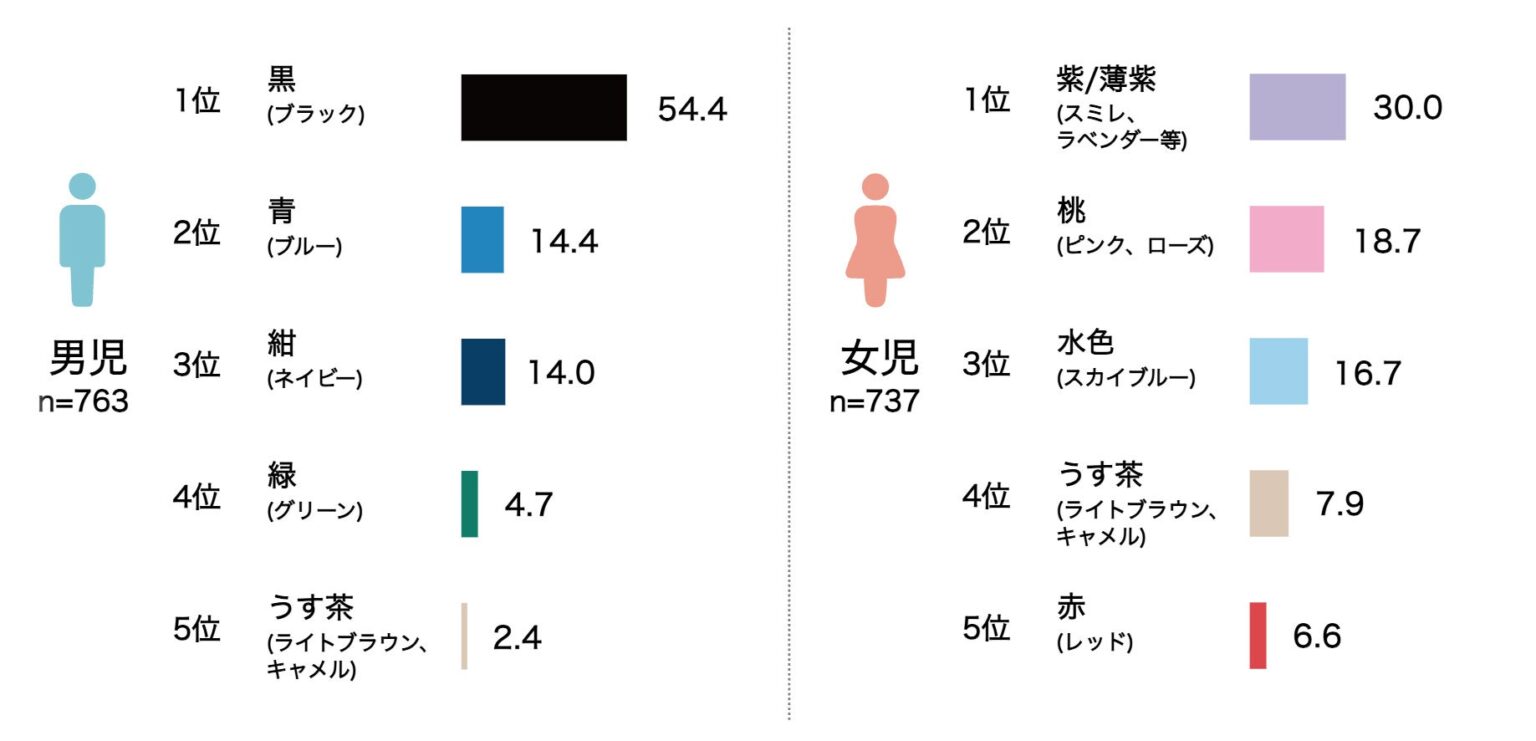 色は男の子で「黒(ブラック)」が54.4%と最多で、定番色の強さが続きました。一方、女の子は「紫/薄紫」が30.0%で最も高く、従来多かった赤系の比率は低下傾向だとしています。購入の決め手は「子どもの好きな色かどうか」が52.5%で最多となり、「デザインがよかった」も35.1%に上りました。