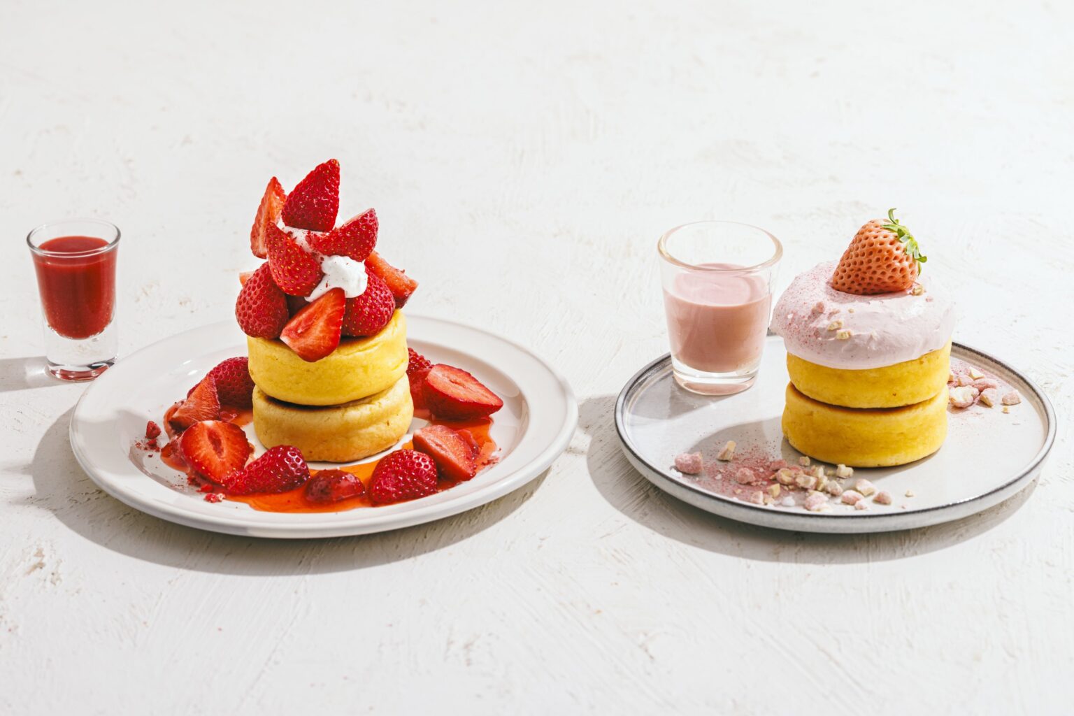 同店の「あまおう ビスケットパンケーキ」(税込2,970円)は、あまおうとあまおうジェラートを組み合わせ、いちごソースをかけて提供します。渋谷神南店と自由が丘店で扱う「いちごミルクドーナツ」(税込682円)は、いちごソースを中に閉じ込め、練乳いちごマーブルソースで仕上げます。