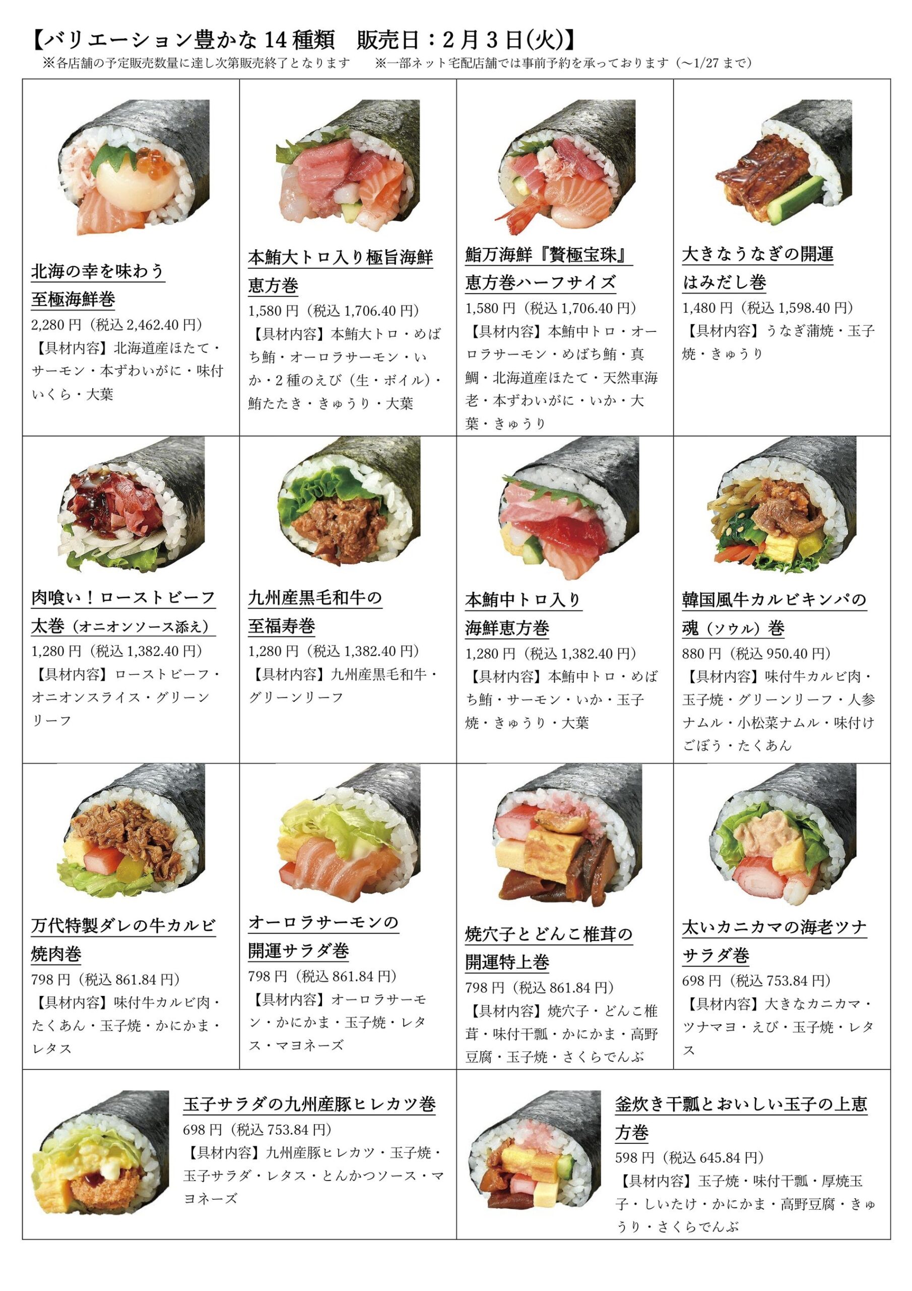 ラインナップは「こだわりの贅沢な一本」と「値ごろ感のある定番の一本」を組み合わせて選べる設計です。商品例として、「北海の幸を味わう至極海鮮巻」「大きなうなぎの開運はみだし巻」「肉喰い!ローストビーフ太巻」「釜炊き干瓢とおいしい玉子の上恵方巻」などがあります。また、一部のネット宅配店舗では事前予約(~1月27日まで)に対応します。