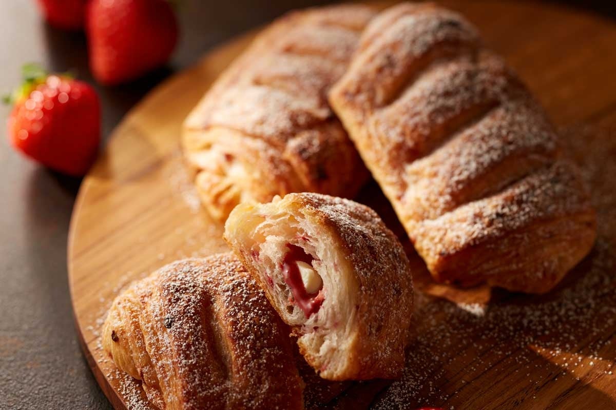商品は、生地にいちごを折り込み、フランス産いちごチョコレート「ヴァローナ」を包んで焼き上げた仕様です。同社は、バターの香りといちごの酸味の組み合わせを特徴として示しています。