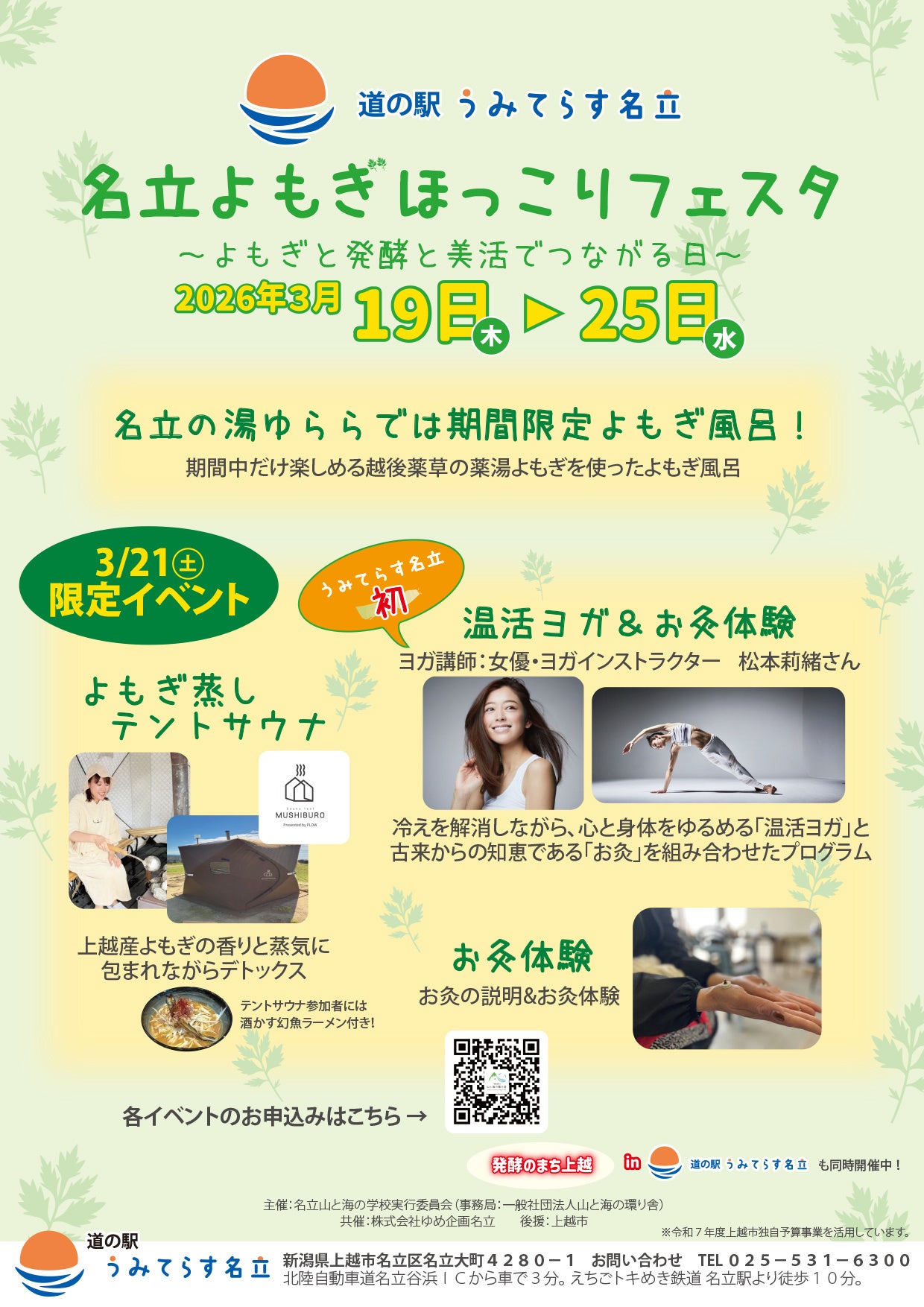 新潟県上越市の道の駅「うみてらす名立」で、体を温める体験型イベント「名立よもぎほっこりフェスタ」が2026年3月19日〜25日に開かれます。会場の「名立の湯ゆらら」では期間中、よもぎ風呂を提供し、入館料は大人800円です。