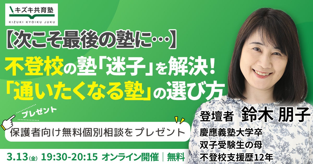 不登校の子どもの「塾選び」に悩む保護者や本人に向け、キズキ共育塾は2026年3月13日19時30分〜20時15分、無料のオンラインイベントを開きます。参加費は無料で、テーマは「塾『迷子』を解決する通いたくなる塾の選び方」です。