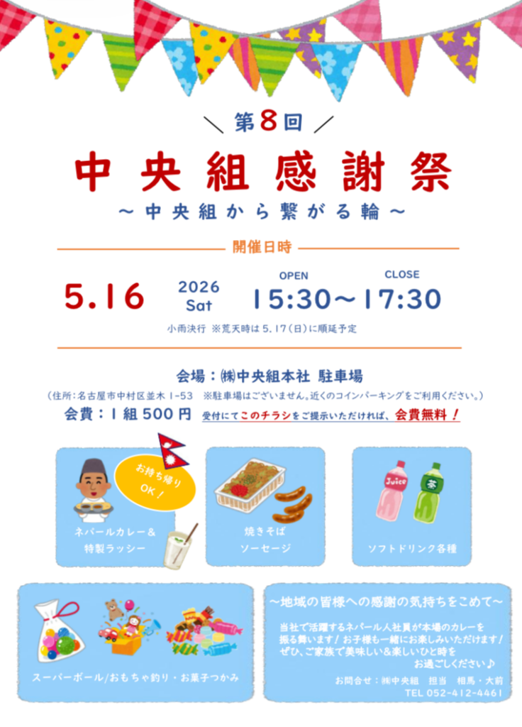 株式会社中央組(愛知県名古屋市中村区、代表・吉川誠)は2026年5月16日(土)15時30分〜17時30分、地域向けイベント「第8回中央組感謝祭『〜中央組から繋がる輪〜』」を中村区内の会場で開く。今回で8回目の開催となり、近隣住民や家族連れの来場を見込む。
