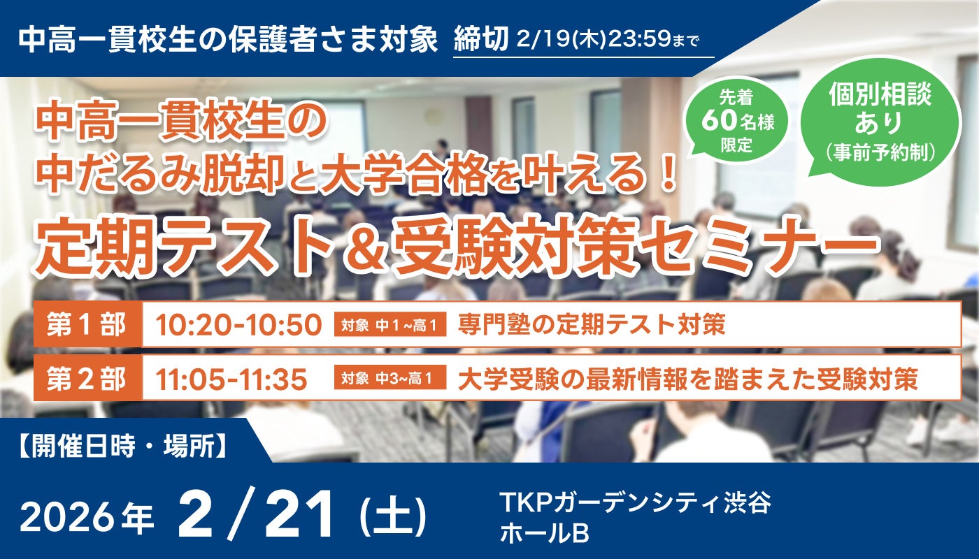 中高一貫校専門の個別指導塾WAYS(運営:メイツ、東京都新宿区)は2026年2月21日、渋谷のTKPガーデンシティ渋谷で保護者向け無料セミナーを開きます。定員は先着60名で、申込締切は2月19日23時59分です。これまでの同種セミナーの累計参加者は500名としています。