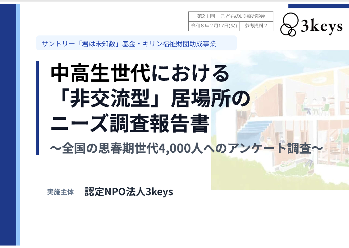 認定NPO法人3keys(東京都新宿区)は2026年2月20日、全国の13〜18歳の中高生世代約4,000人を対象にした「非交流型」居場所ニーズ調査を公表しました。結果では、思春期世代の33.0%が「一人で静かに過ごしたい」「知っている人に会いたくない」といった非交流ニーズが高い層に当たるとしています。