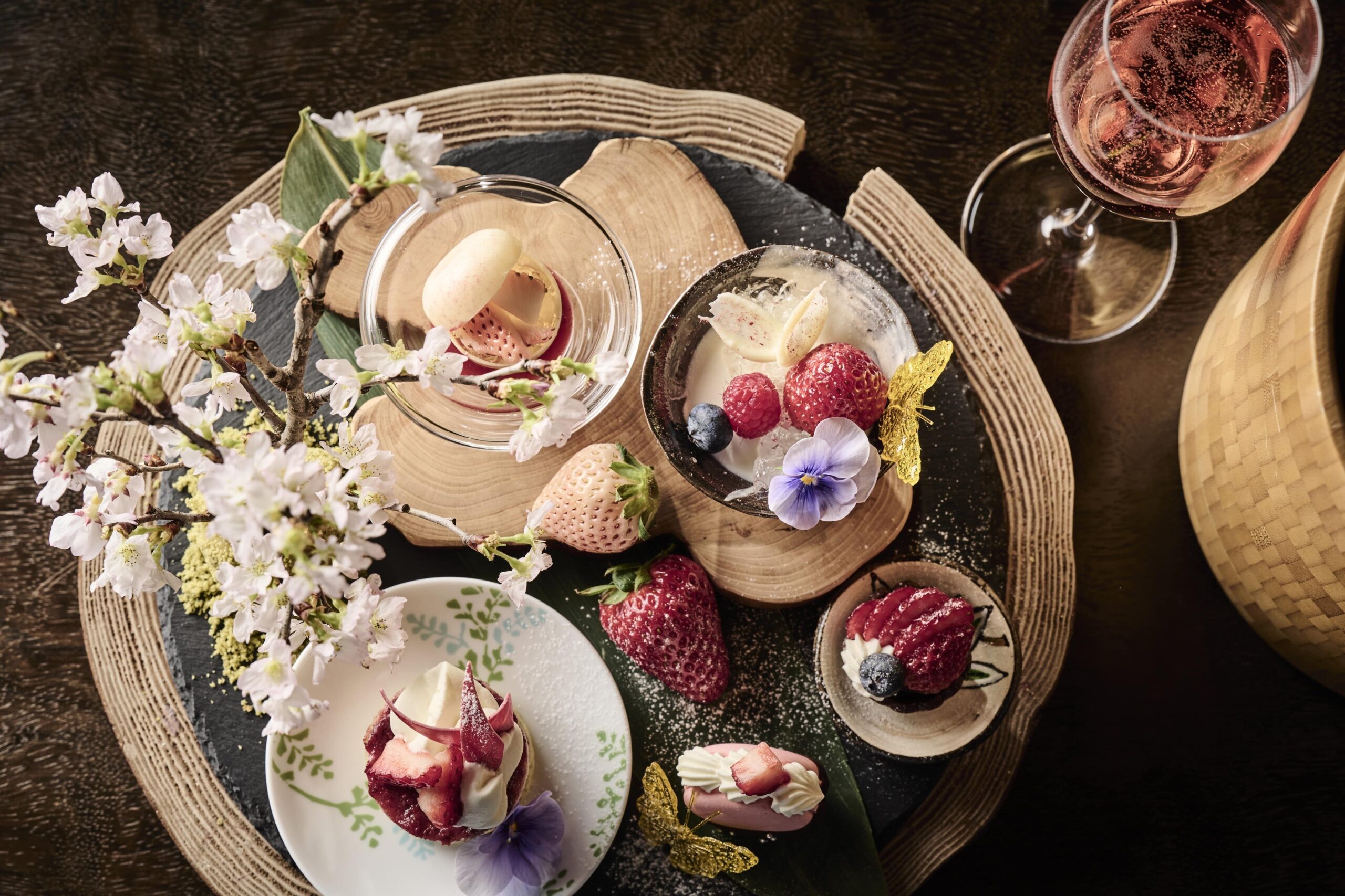 客室でのプチアフタヌーンティー形式で、京都産いちごを中心とした一口サイズの春スイーツとともに、1室につきフルボトルのスパークリングワイン1本が付きます。滞在中の食事は、夕食がイタリア料理または日本料理のフルコース、朝食は和食または洋食から選べます。