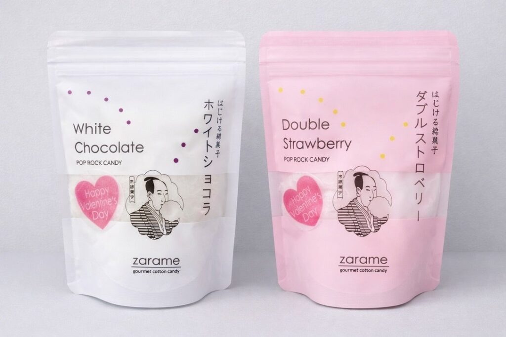 京都・嵐山発の京綿菓子専門店「zarame」は、バレンタイン向けの期間限定商品「はじける綿菓子」を令和8年2月1日から14日まで販売します。味は「ダブルストロベリー」と「ホワイトショコラ」の2種類で、価格はいずれも1袋497円(税込)です。