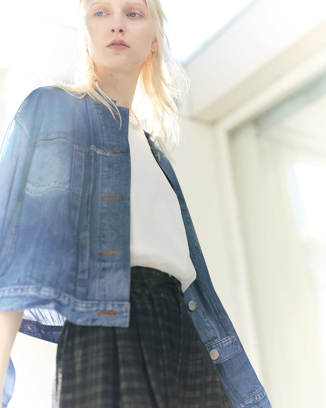 素材には福井県産の軽やかな生地を採用し、「見た目はデニム、着心地は軽やか」というギャップを狙います。京都の染色・プリント技術など日本の職人技に注目し、現在のファッションとして表現する意図だとしています。