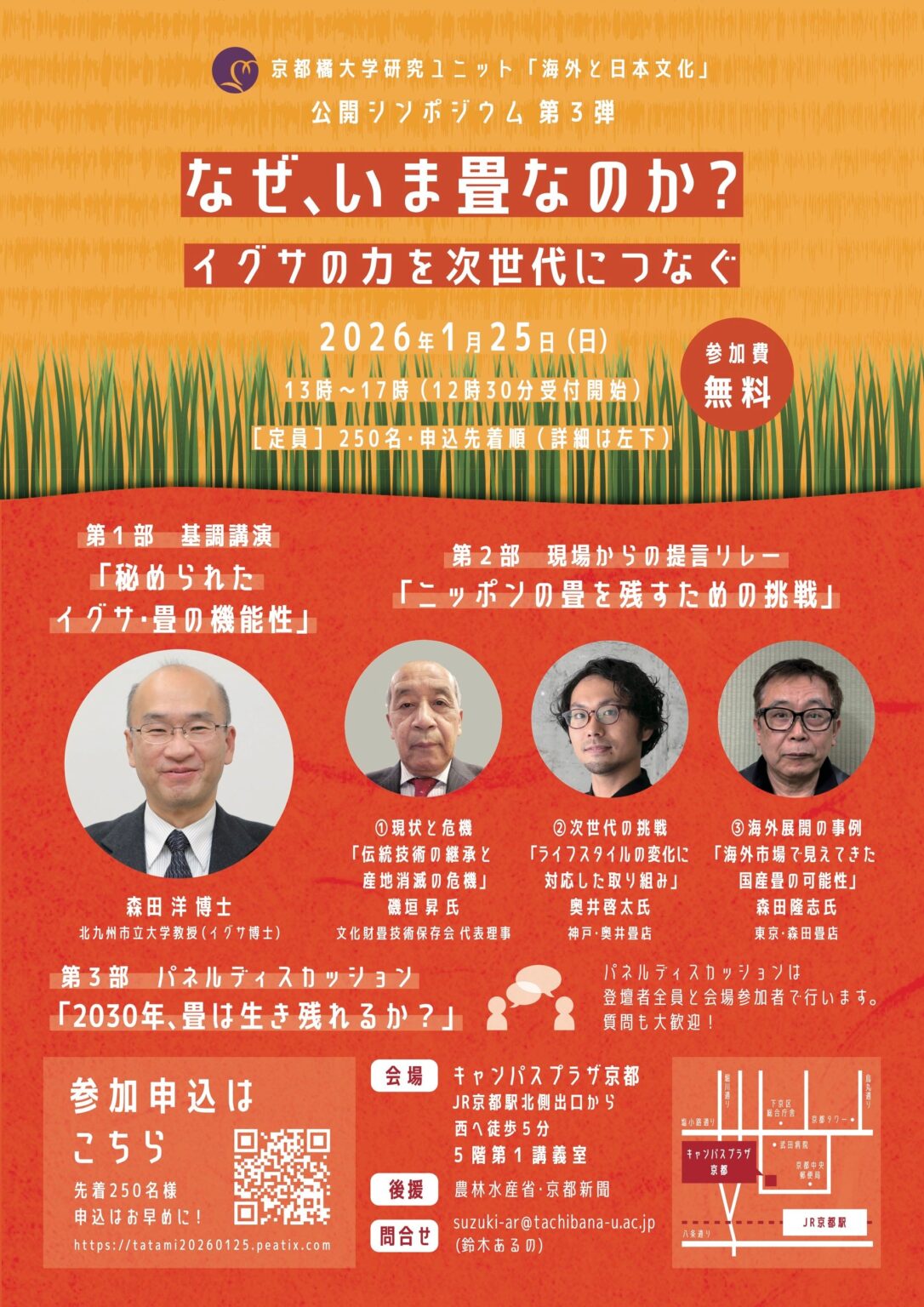 京都橘大学の研究ユニット「海外と日本文化」は2026年1月25日、公開シンポジウム「なぜ、いま畳なのか?-イグサの力を次世代につなぐ-」をキャンパスプラザ京都で開きます。会場定員は250人で参加無料、事前申込制です。調湿性や消臭性などを持つ畳の価値を、産地縮小や職人高齢化の現状とともに議論します。