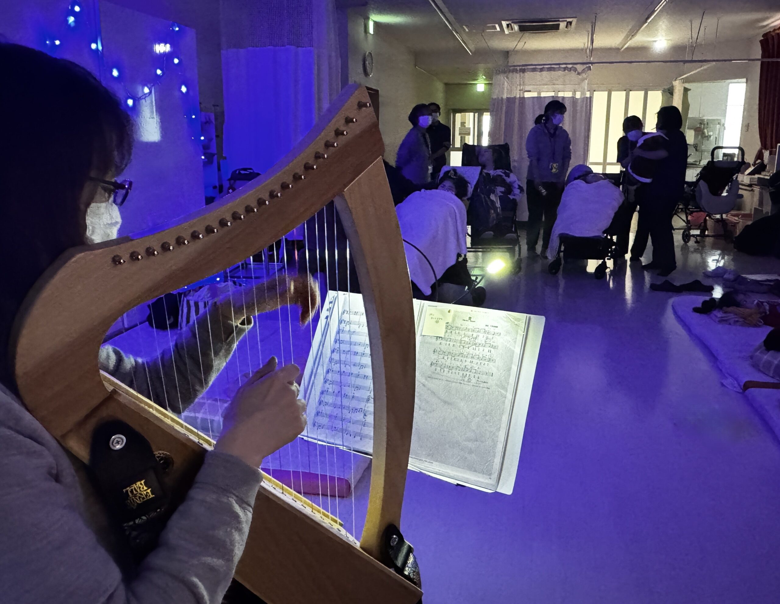 宮城県仙台市泉区の通所施設「あいの実ラズベリー」で2025年12月24日、ベッドサイドでの訪問ハープ奏者・曽我あかね氏がミニハープを演奏し、利用する子ども8名が音色に耳を傾けました。同氏にとって、社会福祉法人あいの実の通所施設での訪問演奏は三回目で、3施設すべてへの演奏訪問を達成しました。