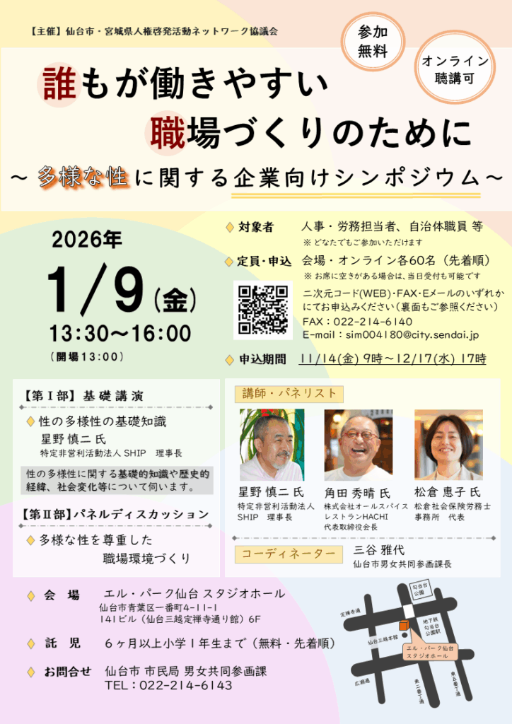 仙台市は1月9日(金)13:30~16:00、エル・パーク仙台スタジオホール(青葉区一番町4-11-1、141ビル6階)で、企業向けに性の多様性をテーマとするシンポジウムを実施します。申込は専用フォームから、期限は12月17日(水)17時。席に余裕があれば当日受付も可能です。