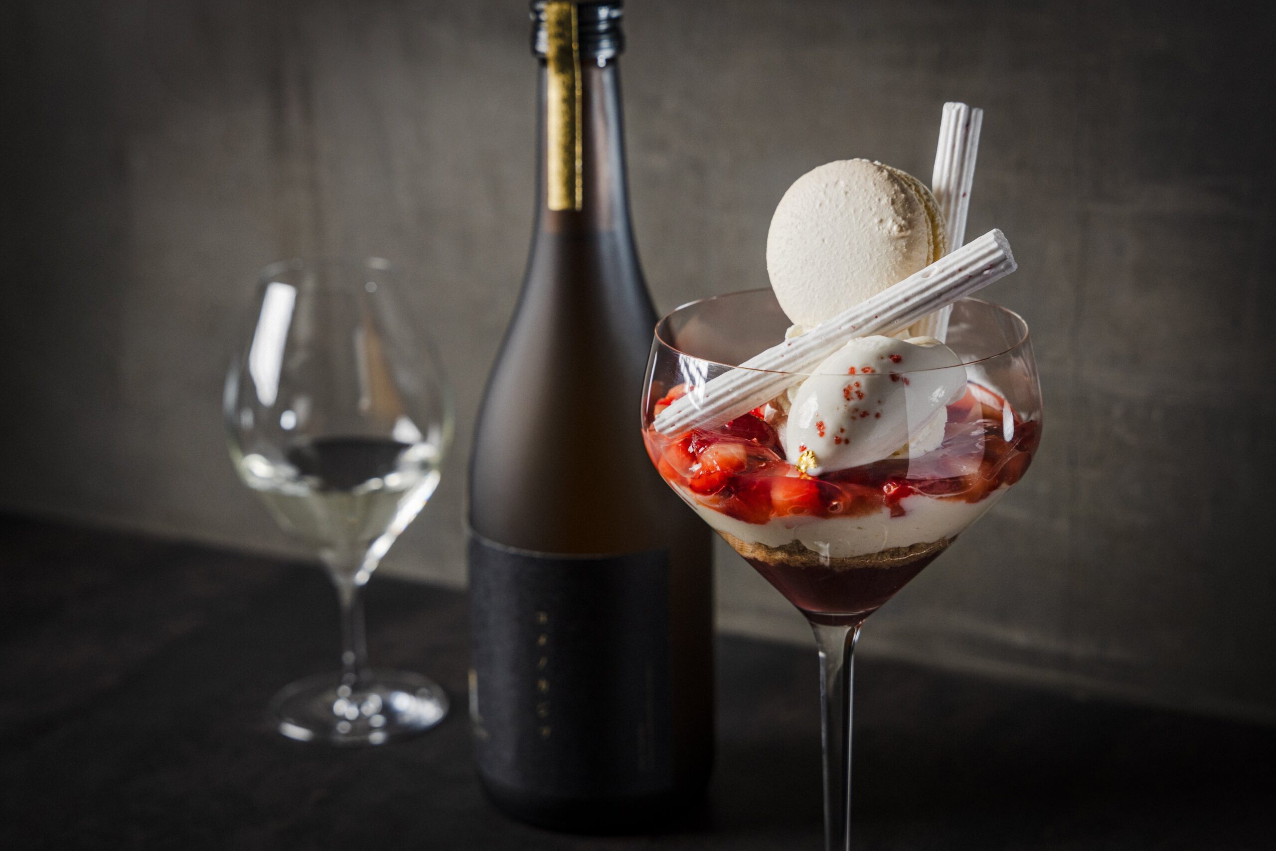 完全会員制パフェバー「Remake easy」、3月限定「桜と日本酒"コメノカジツ"の酒粕マカロンパフェ」が登場、北海道産酒米「きたしずく」から生まれた限定日本酒と苺が重なる春の一杯。