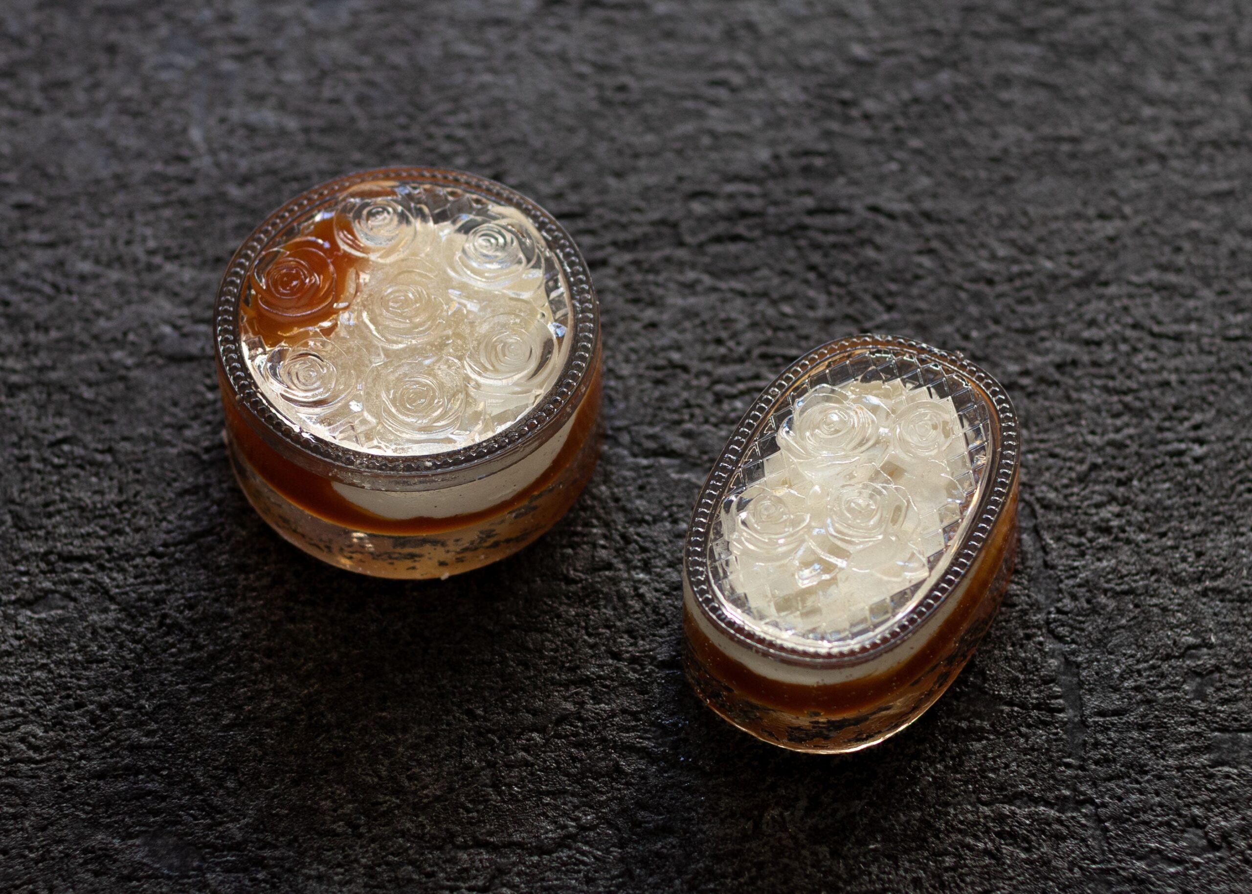 新作は、正倉院宝物をイメージした「空想正倉院宝物菓子」シリーズの一環で、光を味わう造形を掲げる工芸菓子です。透明な琥珀羹(水晶ゼリーのような菓子)の中に、深く煮詰めたキャラメルと濃厚なバター生地を閉じ込めた「水晶酪菓」と呼ぶ構成が特徴で、サイズは直径40mm前後と一口大に設計されています。