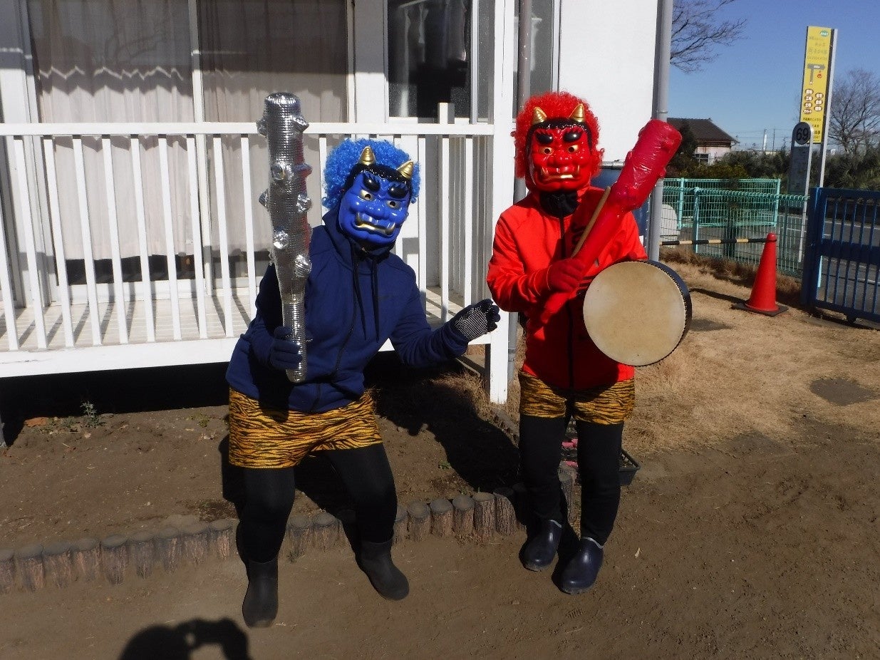 当日は、園児が節分の話を聞いたうえで升や紙の豆を作るなど準備段階から参加し、園ごとの演出で職員が鬼役を務めます。西武中央保育所では、鬼の顔が見えるよう頭にお面を付ける形を採り、怖さへの配慮も行います。