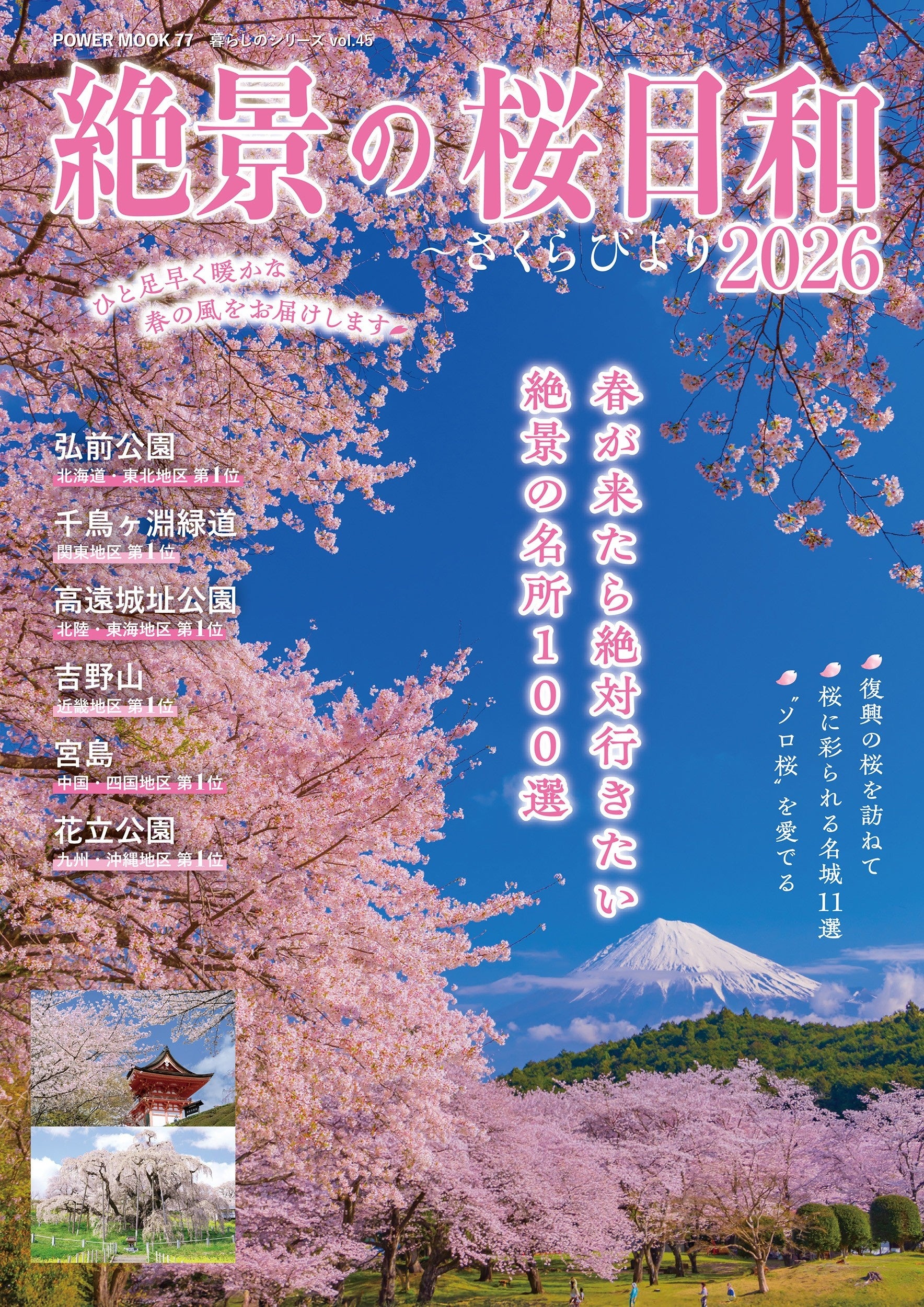 大洋図書は1月16日、全国の桜の名所をまとめたムック『絶景の桜日和2026』を発売します。掲載数は100スポットで、価格は1,210円(税込)。A4判・総96頁のオールカラーです。収録は定番の花見名所に加え、近年注目される景観や穴場的スポットも含みます。構成は地域別(北海道・東北、関東、北陸・中部、近畿、中国・四国、九州・沖縄)で、弘前公園、千鳥ヶ淵緑道、高遠城址公園、吉野山、宮島、今帰仁城跡などを例示しています。特集として「名城×桜」や、巻末グラフ「夜桜絶景~花の宵」も掲載し、昼夜の見どころを整理します。さらに「全国標本木案内」や「桜カレンダー」など、開花時期の目安を把握しやすいコラムも収録しました。花見計画の情報源として、春の旅行需要に向けた活用が見込まれます。