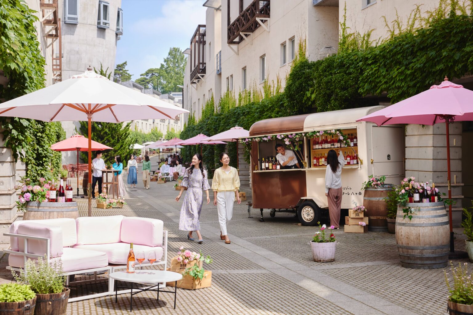 会場はロゼワインの色彩をイメージしたパラソルやソファで装飾し、散策しながら楽しめる演出とします。キッチンカーでは、マスカット・ベーリーAのロゼワインに合わせた苺スイーツ3種(2,000円、税込)や、カクテル/モクテル(各1,000円、税込)を11:00〜17:00に提供します。ワインは仕入れ状況により内容が変わる可能性があります。