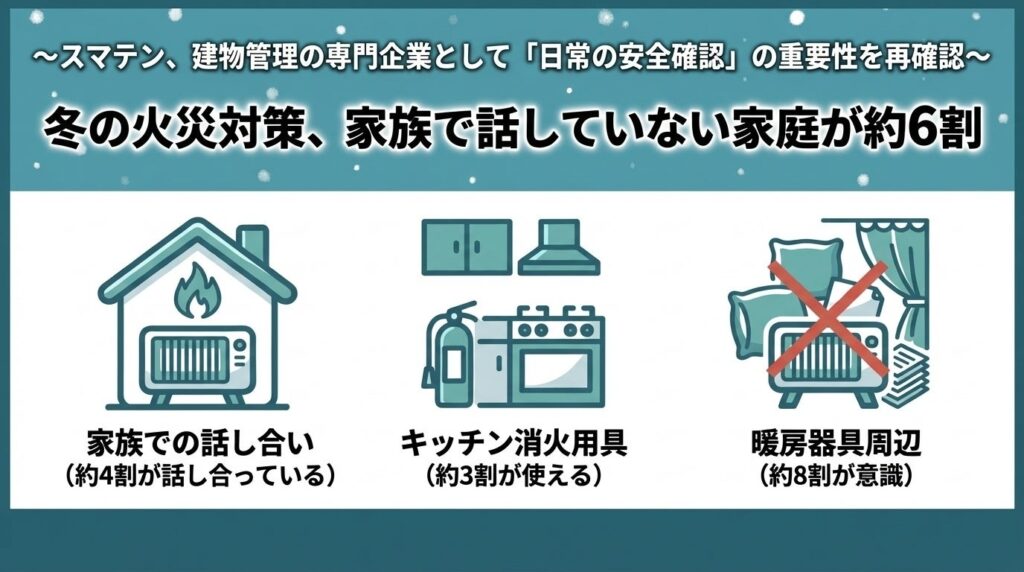 建物管理DXを手がけるスマテンが全国15〜99歳の男女70人に冬の火災意識を調べたところ、冬の火災リスクを家族と「話したことがない」は43人(約61%)だった。キッチン周りの消火器などが「使える状態になっていない」も34人(約49%)に達した。調査は2025年12月23日にインターネットで実施。冬は暖房器具の使用増加と乾燥で火災が起きやすい一方、「暖房器具の周りに燃えやすい物を置かない」と答えたのは54人(約77%)で、日常の注意は一定浸透していた。スマテンは、設備が設置されているだけでなく、実際に使える状態かを確認し、出火時の行動や役割分担を家族で共有する「日常の安全点検」が重要だとしている。今後は年末や季節の変わり目などの節目に、消火用具の点検と短時間の話し合いを習慣化できるかが焦点となる。