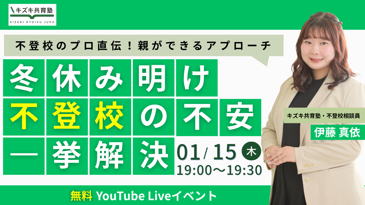 キズキ共育塾(運営:株式会社キズキ、東京都新宿区)は2026年1月15日19時から、冬休み明けの不登校・行き渋りに悩む保護者向けの無料オンラインイベントをYouTube Liveで開きます。配信は30分で、匿名視聴でき、見逃し向けにアーカイブも残します。冬休み明けは連休明けと「新年」という心理的節目が重なり、休み中は「年明けは頑張る」と話していた子どもが当日動けないなど、行動面のつまずきが表面化しやすい局面です。登壇するのは同塾の専任相談員、伊藤真依氏で、不登校の当事者経験と教室長としての相談対応を踏まえ、「学校に行かない」という結果だけに注目しない考え方や、スロースターターの子どもに対する家庭での関わり方を説明します。伊藤氏は「頑張る」は抽象的で、達成基準が曖昧なまま自己肯定感が削られる場合があるとし、「どんな自分になりたいか」と「今やること」を具体化する重要性を示しています。同塾は、冬休み明けに出遅れたと感じる家庭でも立て直しは可能だとしており、1月中の過ごし方の整理が支援の入口になると位置付けます。今後は、こうした短時間のオンライン企画が、保護者の情報取得の導線としてどこまで定着するかが焦点になりそうです。【イベント情報】