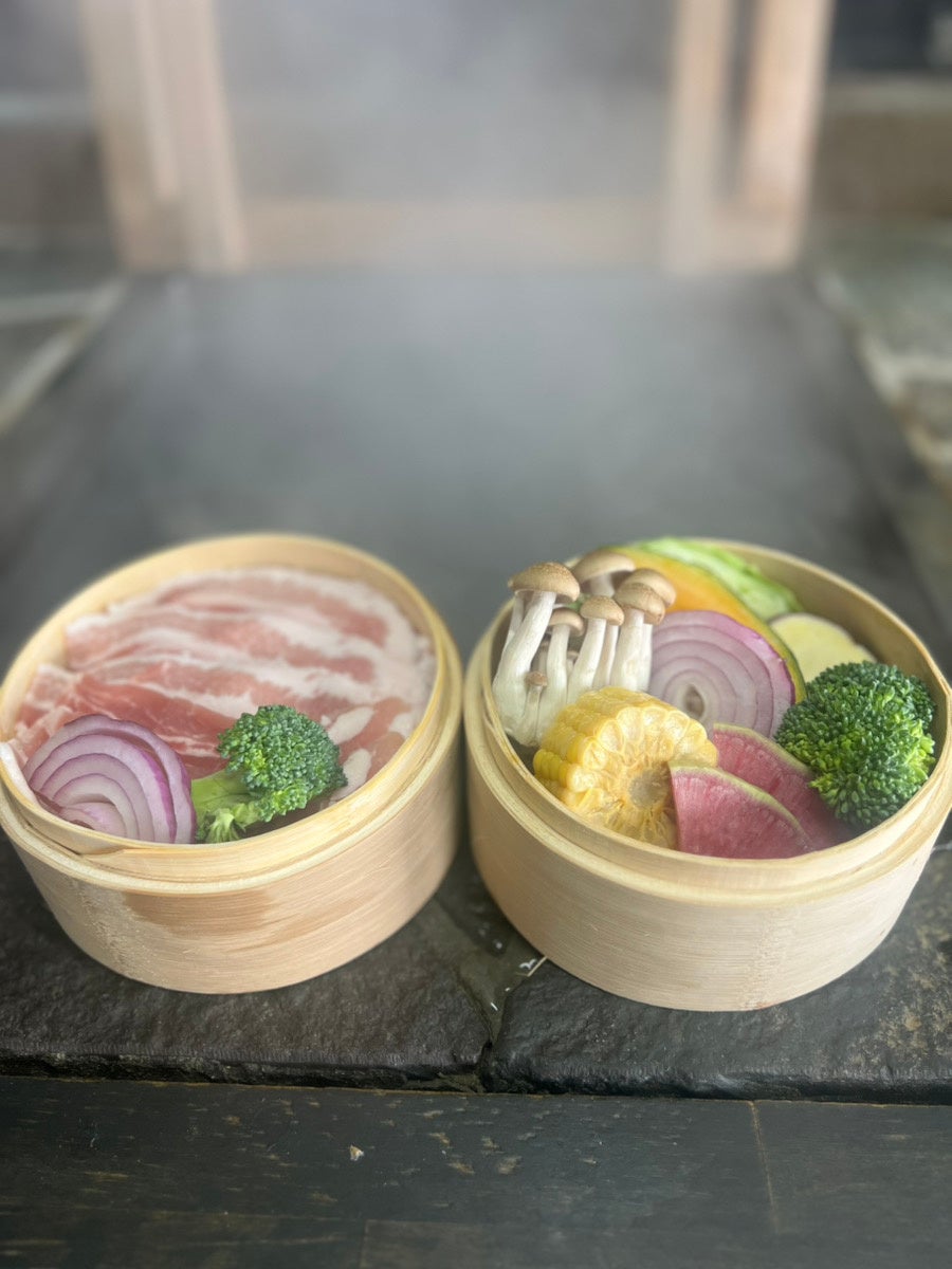 地獄蒸しは、温泉の蒸気と地熱で食材を蒸し上げる別府名物の調理法です。同セットは源泉十割(加水・加温なし)の蒸気を使う点を特徴とし、野菜せいろは甘みと香り、豚せいろは余分な脂を落としてやわらかさと旨みを引き出すとしています。別府冷麺やかぼすうどん、とり天定食など既存メニューに「ちょい足し」する使い方を想定します。