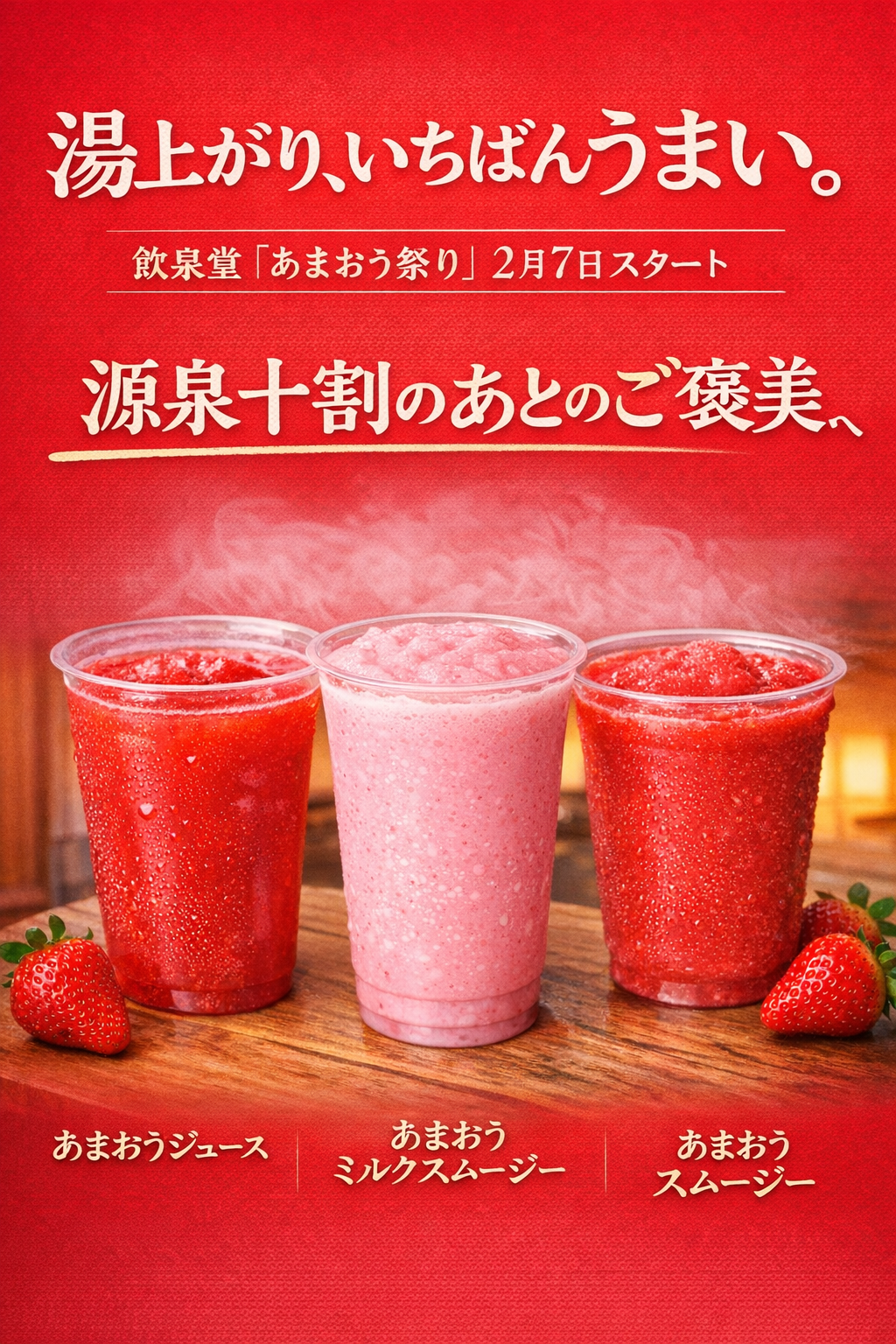 狙いは、温泉入浴後に失われやすい水分・糖分・ビタミンを補い、湯上がりの「ご褒美」として飲料を提案することです。あまおうは甘みと酸味のバランスが特徴で、湯上がり需要に合わせたメニューとして打ち出します。