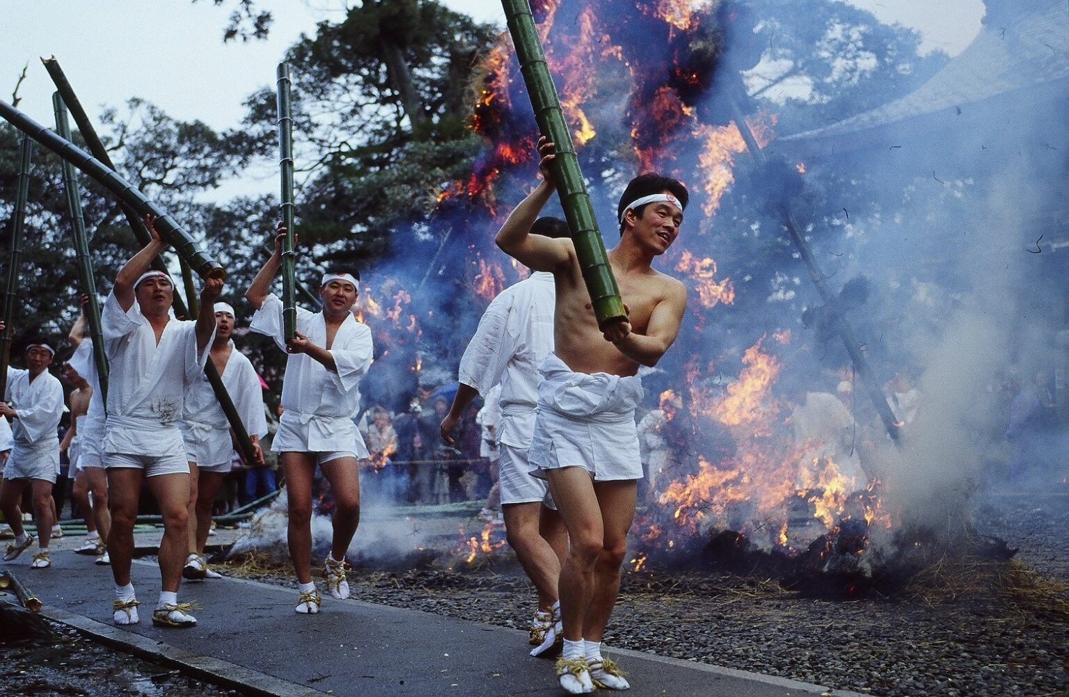 神事では、氏子らが大縄で作った大蛇を境内中引き廻した後、橋の上から大聖寺川へ投げ込みます。割られた青竹は縁起物として自由に持ち帰れるとされています。
