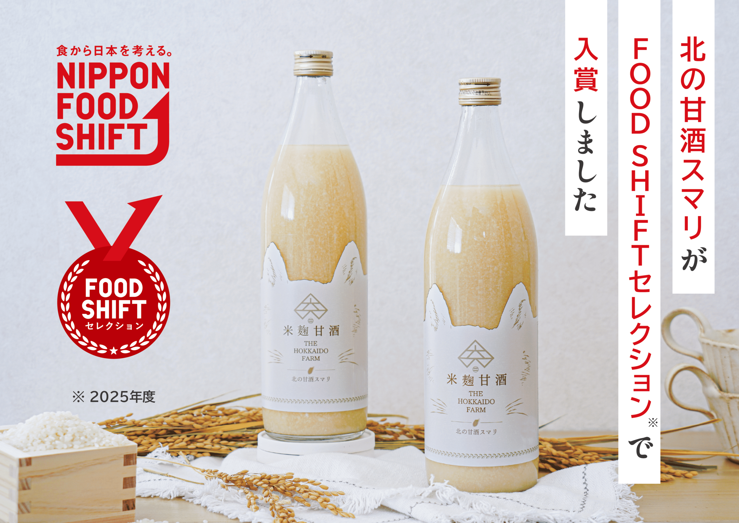 The北海道ファーム(北海道栗山町)の米麹甘酒「北の甘酒スマリ」が、農林水産省が進める「ニッポンフードシフト」表彰事業の2025年度「FOOD SHIFTセレクション」で入賞した。評価は「地産地消または国産農林水産物の消費拡大」の観点で、流通・外食事業者などの専門家が審査した。商品は自社農場の米「おぼろづき」(北海道産水芭蕉米)と米麹のみを使い、容量は900ml、砂糖不使用が特徴だ。背景には、農業現場で課題となる規格外米の発生があり、品質・味に優れた規格外米も原料として活用して食品ロス削減を狙う。今後は小売・EC・業務用で販路を広げ、他地域の米を甘酒にする商品化や海外販路の開拓も進め、国産米の付加価値向上につなげる方針としている。