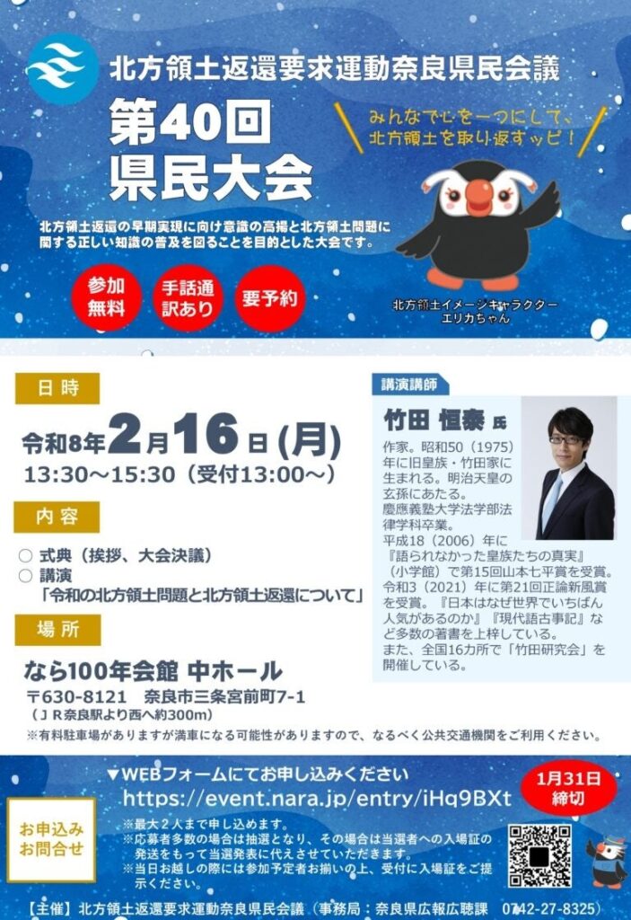北方領土返還要求運動奈良県民会議は、北方領土返還の早期実現に向けた意識啓発として「第40回奈良県民大会」を2026年2月16日13時30分から奈良市のなら100年会館中ホールで開きます。参加費は無料で事前申込制、締切は1月31日です。式典では開会挨拶や来賓挨拶、大会決議などを行い、続いて作家の竹田恒泰氏が「令和の北方領土問題と北方領土返還について」をテーマに講演します。受付は13時開始で、手話通訳にも対応します。応募者多数の場合は抽選となり、当選者には入場証を発送して結果通知に代える方式です。主催者は当日の駐車場混雑を見込み、公共交通機関の利用を勧めています。今後、参加状況や社会情勢を踏まえ、継続的な啓発の場づくりが焦点となります。