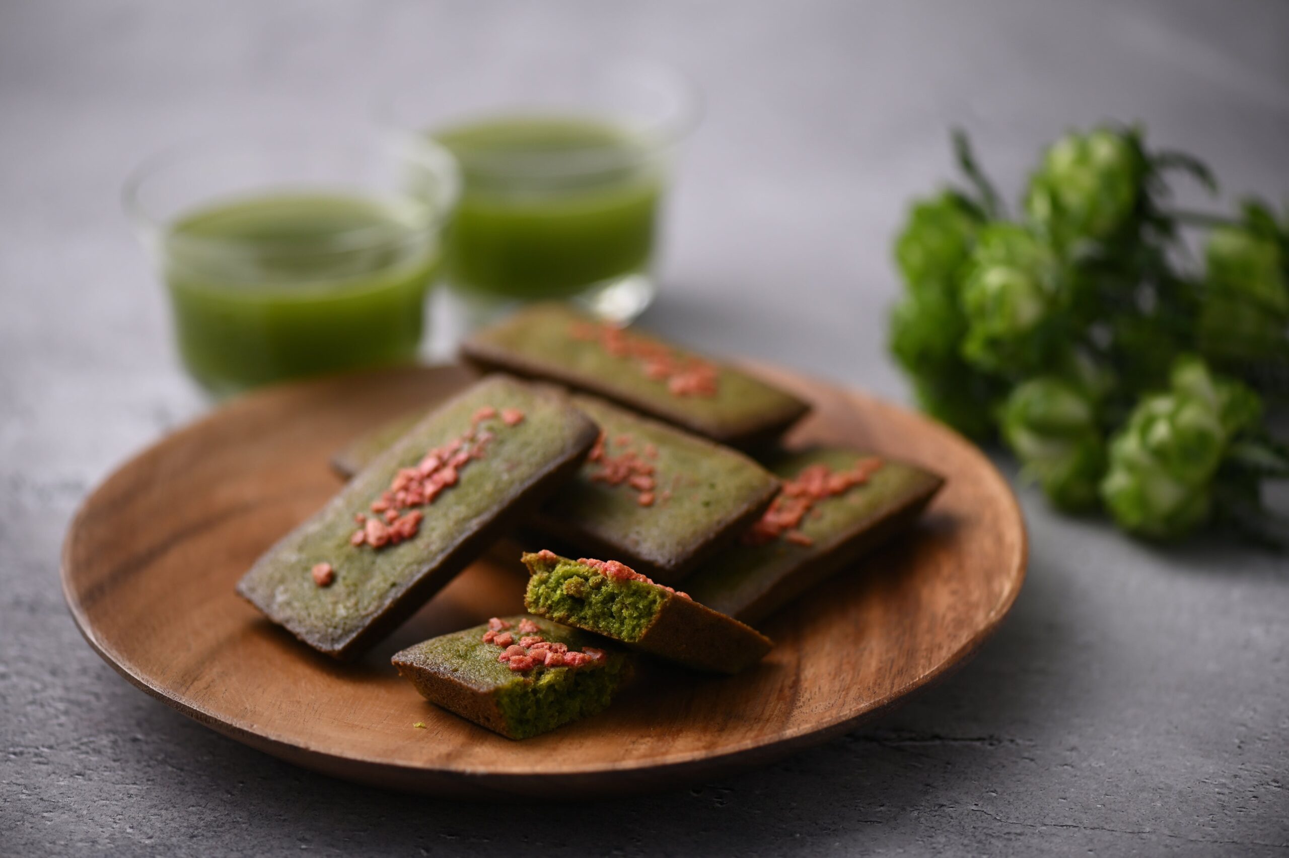 商品は、スペイン産アーモンドプードルと発酵バターを使った生地に、静岡県産「天空の抹茶®」を練りこみ、苺を散りばめたフィナンシェです。「天空の抹茶®」は株式会社 小柳津清一商店の登録商標としています。
