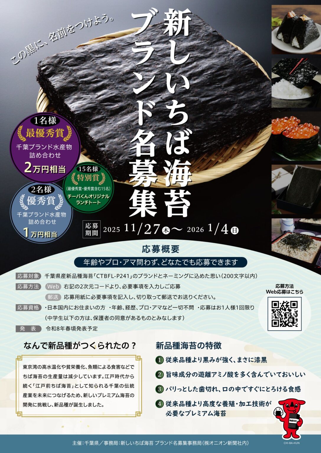 千葉県農林水産部水産局は、従来品種より黒みが強く旨味も高い新品種海苔「CTBFL-P241」のブランド名を、2025年11月27日から2026年1月4日23時59分まで全国の個人から募集しています。年齢やプロ・アマを問わず1人1作品まで応募でき、最優秀賞1点には2万円相当の千葉ブランド水産物詰合せが贈られます。
