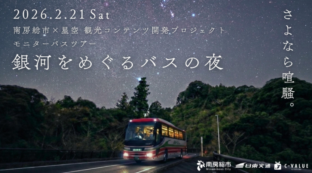 南房総市は2026年2月21日、星空を新たな観光資源として事業化する狙いでモニターバスツアー「銀河をめぐるバスの夜」を実施し、参加者を購入型クラウドファンディング「C-VALUE」で募集します。支援には千葉銀行と、同グループのちばぎん商店が関与します。ツアーは、星空保護区®認定を目指す取組で改修した街灯を巡り光害対策を学ぶ「社会科見学」、地元の天体観測スポットを訪れる「秘境めぐり」、海の幸・山の幸を味わう「美食旅」を組み合わせます。星空保護区®は米国NPOダークスカイ・インターナショナルの国際的枠組みに基づき、暗い夜空の保全を促す考え方で、市は照明の明るさ見直しや啓発を進めてきました。今後は募集結果や参加者の反応を踏まえ、継続商品化とプロモーション強化につなげる見通しです。