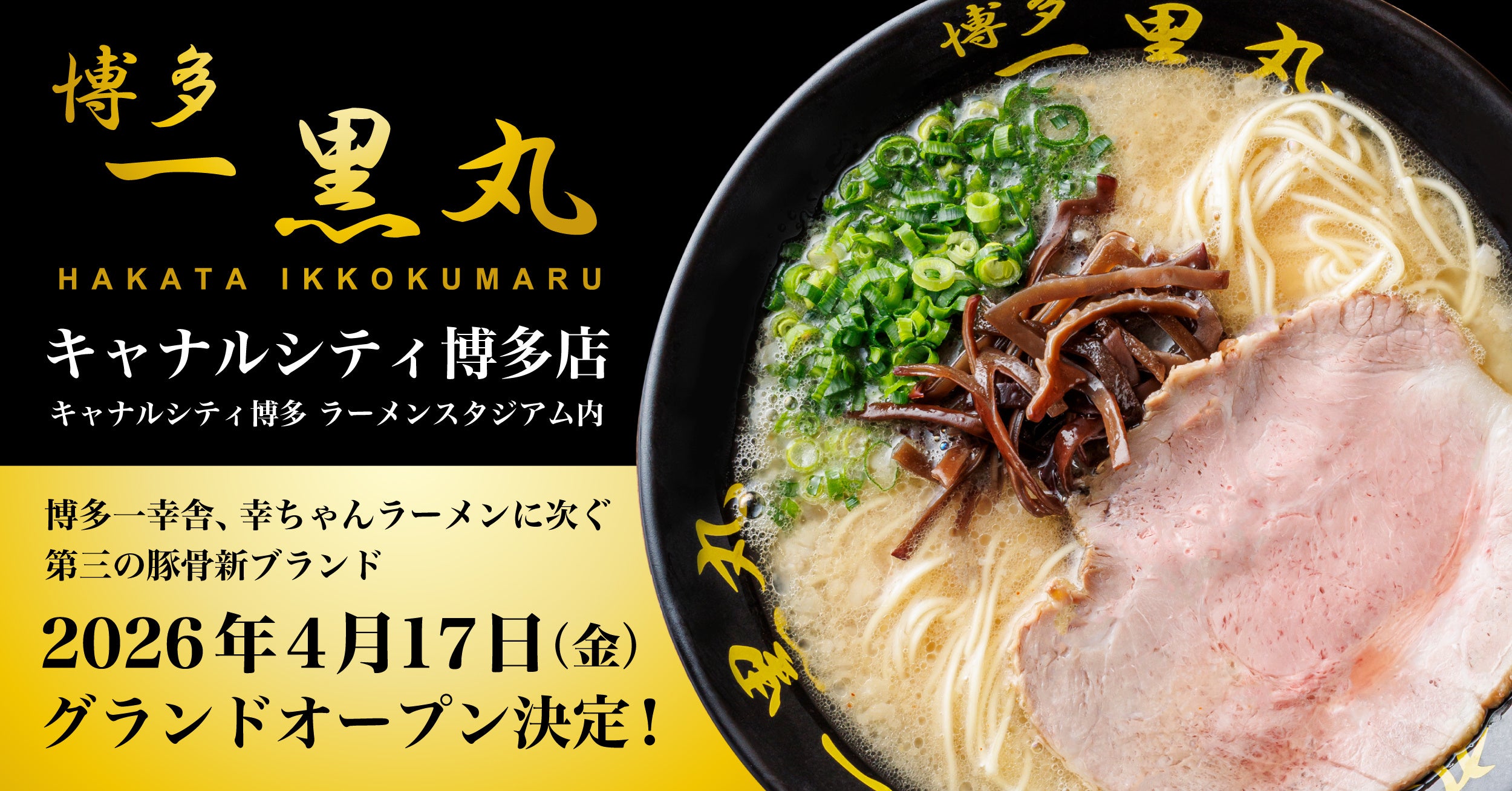 ウインズジャパンホールディングスは2026年4月17日11時、福岡市博多区のキャナルシティ博多センターウォーク5階「ラーメンスタジアム」内に「博多一黒丸 キャナルシティ博多店」を開業します。営業時間は11時〜23時、席数は20席です。