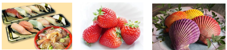 朝どれ商品:佐伯寿司、りゅうきゅう丼、緋扇貝、すり身揚げ、しいたけ、いちご、ぽんかん