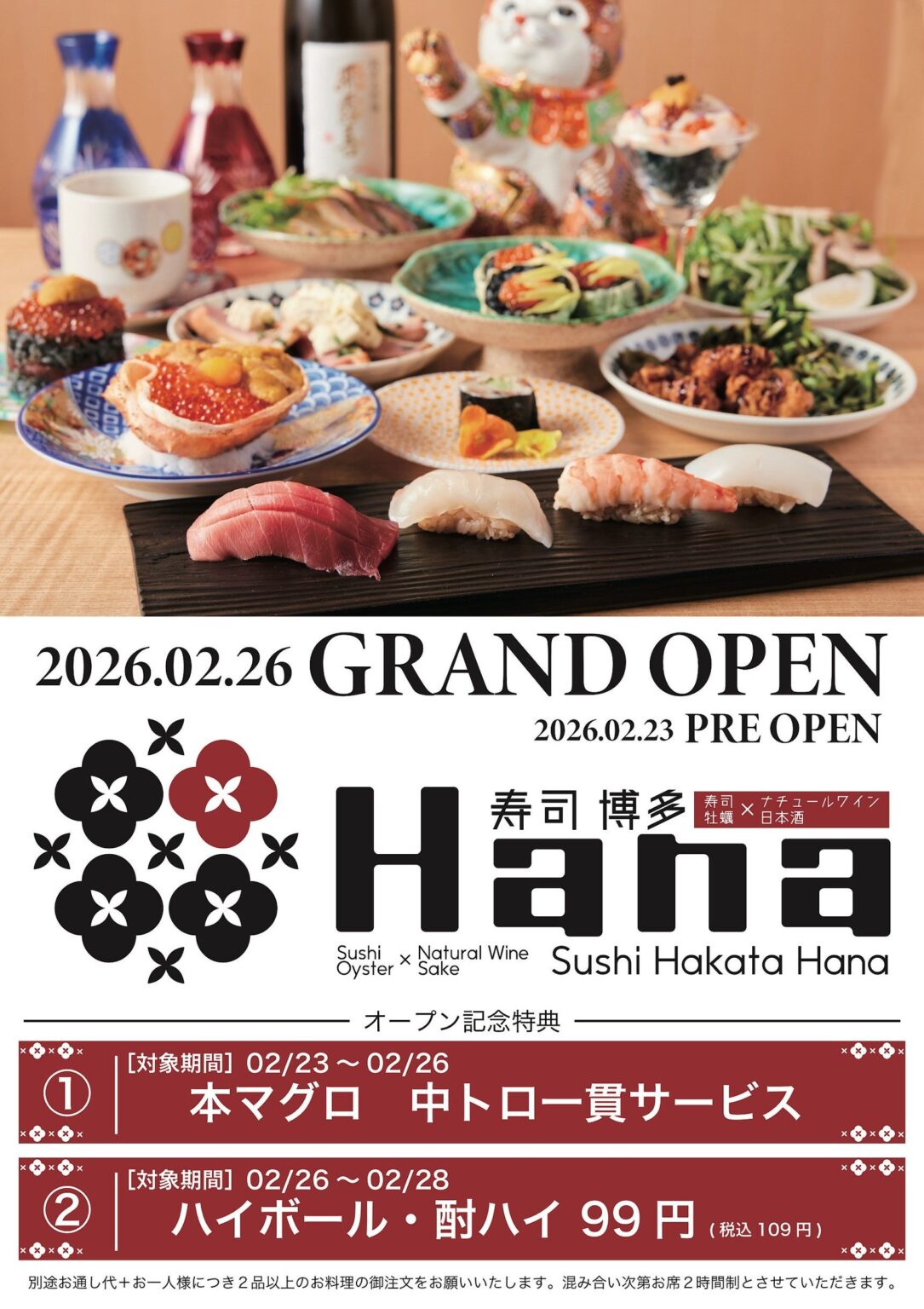 福岡市博多区の博多筑紫口エリアに、寿司と日本酒・ナチュールワインを提供する新店「寿司 博多 Hana(博多Hana)」がオープンします。プレオープンは2月23日12時から、グランドオープンは2026年2月26日16時です。特典①として2月23日〜2月26日に来店者全員へ本まぐろ中トロを1人1貫サービスします。