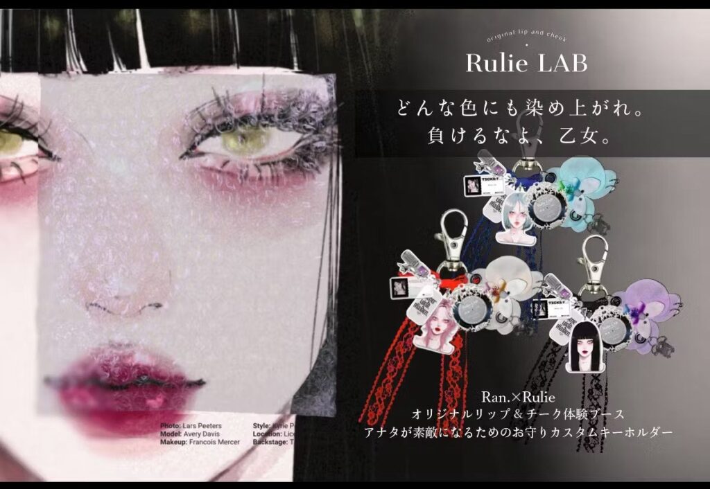 来場者は、作品内の女の子の「リップ&チークメイク」のカラーレシピを参考にしながら、リップ兼チークを自分で調合します。完成品はRan.プロデュースのカスタムキーチャームに装着して持ち帰れる仕組みで、チャームは現地で追加購入も可能とされています。