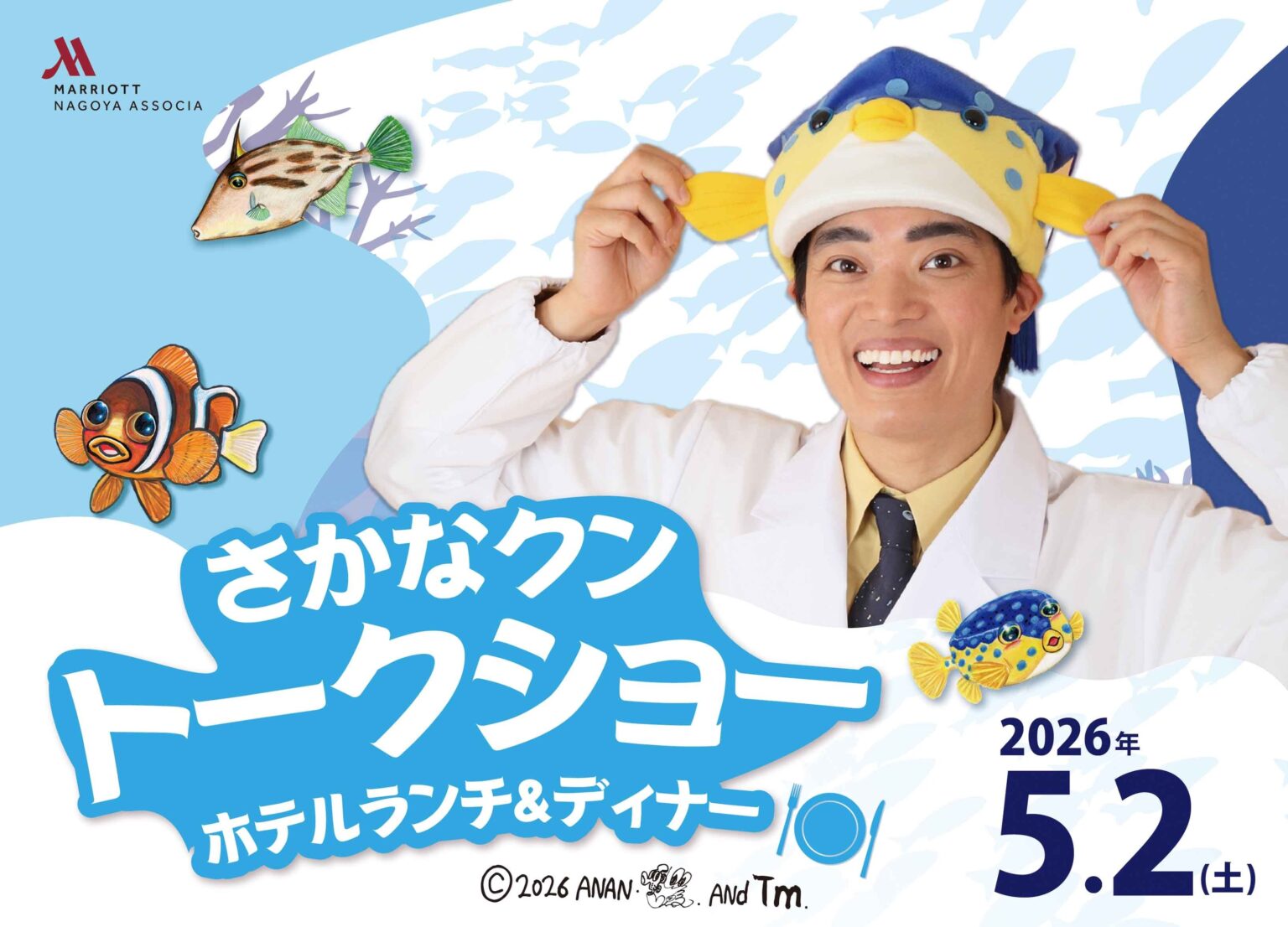 ジェイアール東海ホテルズは2026年5月2日、名古屋マリオットアソシアホテルの16階宴会場「タワーズボールルーム」で、「さかなクントークショー~ホテルランチ&ディナー」を開きます。参加費は大人1万4,000円、4歳~小学生6,000円で、洋食&中国料理ブッフェとソフトドリンク、税・サービス料を含みます。