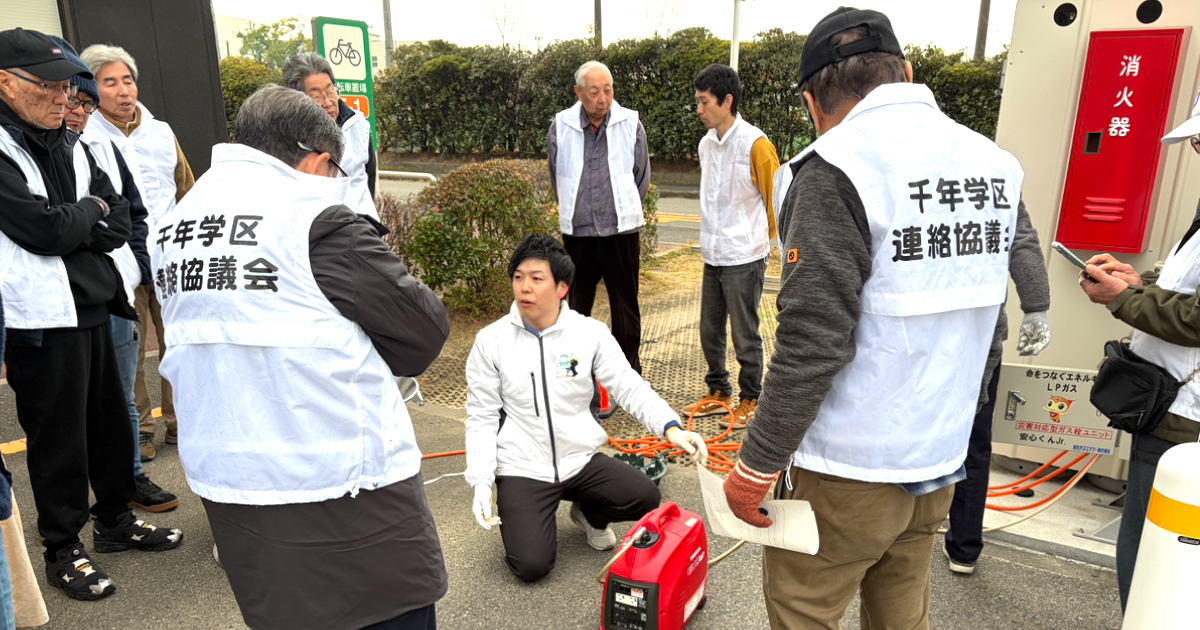 訓練では、災害対応型ランドリーに備える資機材の使い方として、簡易発電機の操作確認、炊き出し用設備の設営と点火、ガス機器や発電機の接続手順を確認しました。停電時でも電源確保や炊き出しができるかを、手順ベースで確かめた形です。
