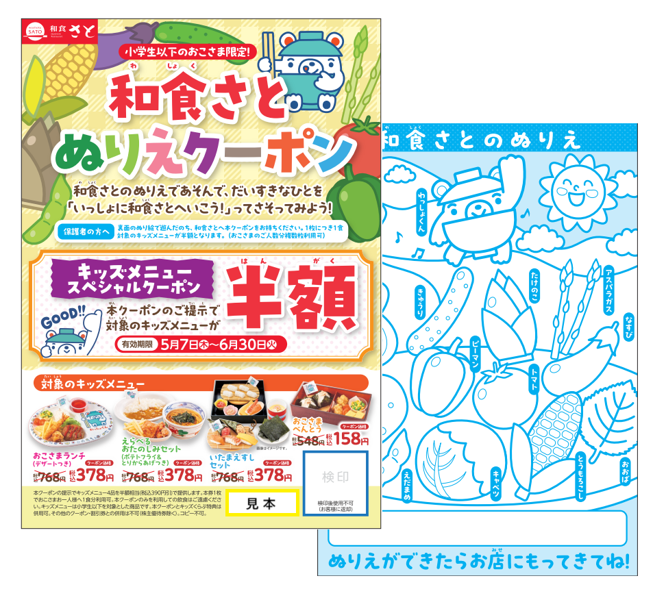 和食さとは4月29日、国内201店舗で「さとキッズくらぶ」会員の小学生以下を対象に、キッズメニューが半額相当になる「ぬりえクーポン」を各店数量限定で配布します。会計時に会員1名につき1枚をレジで渡し、当日入会でも対象です。