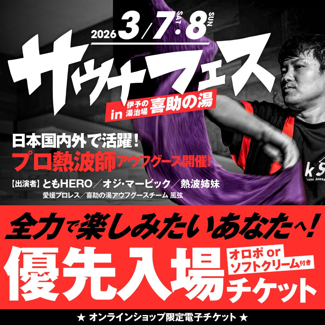 愛媛県松山市の「伊予の湯治場 喜助の湯」は、2026年3月7日・8日に開く「サウナフェス2026」に向け、アウフグースイベントの優先参加チケットを2026年2月4日からオンラインで販売する。価格は1枚500円(税込)で、オロポ1杯またはソフトクリーム1個と交換できる引換特典が付く。