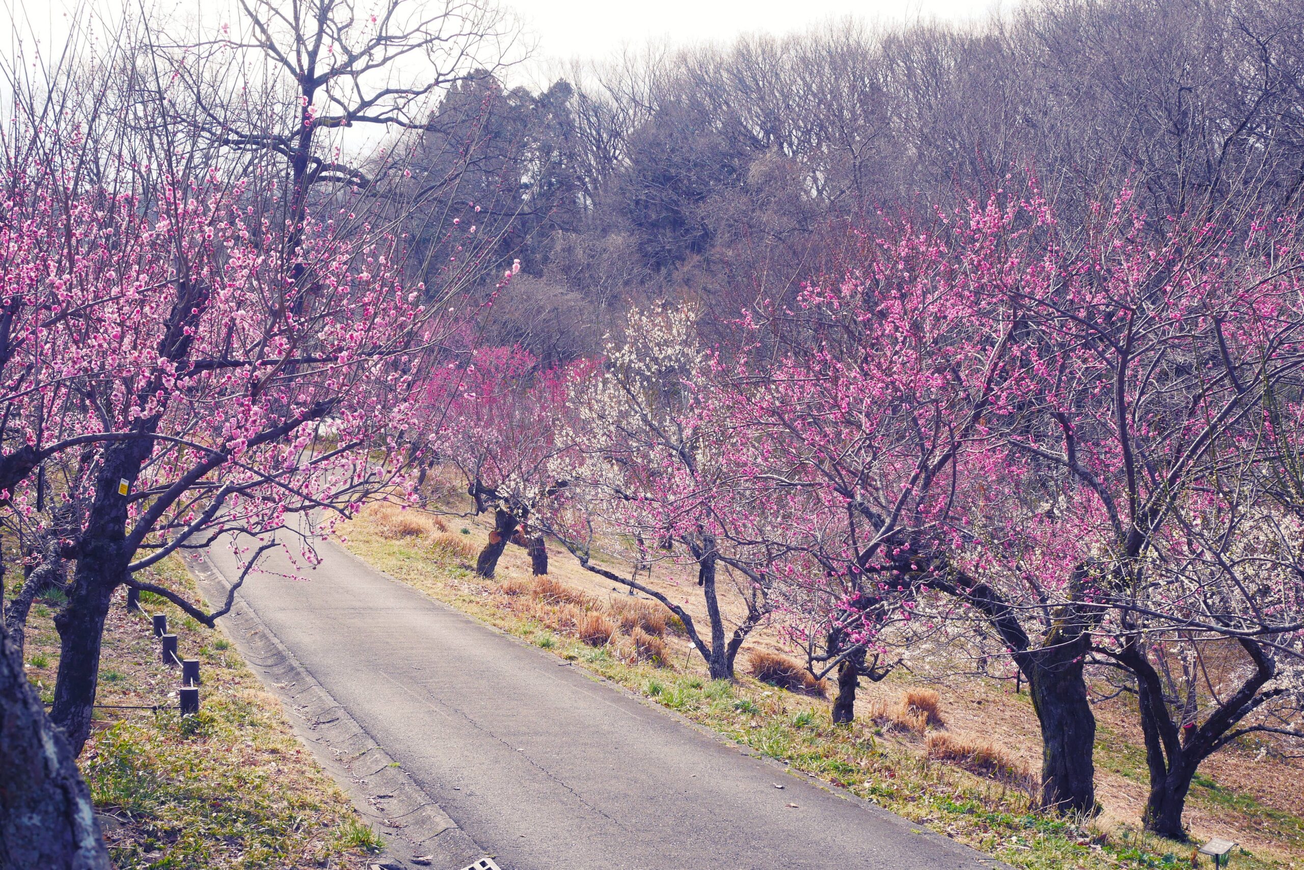 場所は南口から徒歩約10分の梅林です。早咲きから中咲き、遅咲きへと順に開花するため、品種の違いによる花景色を長い期間楽しめます。見頃は天候により前後する場合があります。